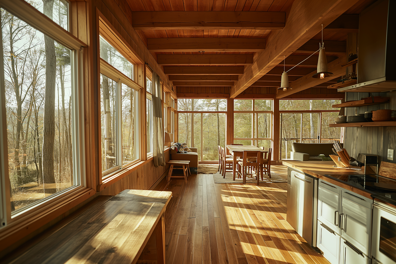 Cozy wooden cabin interior with large windows, modern kitchen, and dining area. Warm lighting and forest views create a serene atmosphere.