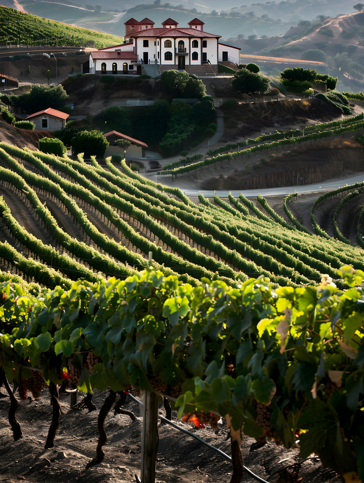 Lush vineyard with a grand estate on rolling hills, bathed in golden light, showcasing vibrant greens and elegant architecture.