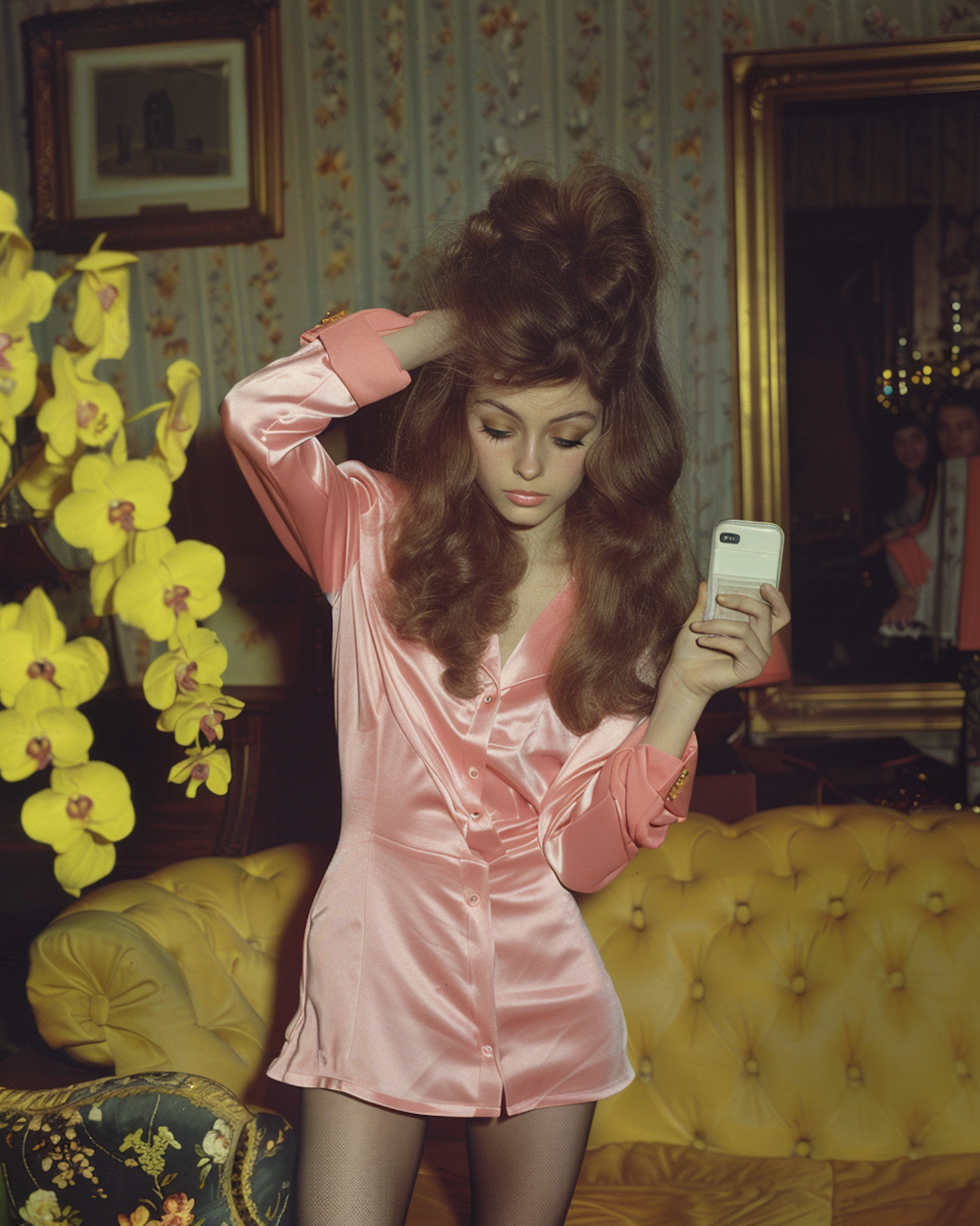 A woman in a pink nightgown with voluminous hair holds a phone in a vintage room with floral wallpaper and yellow flowers.