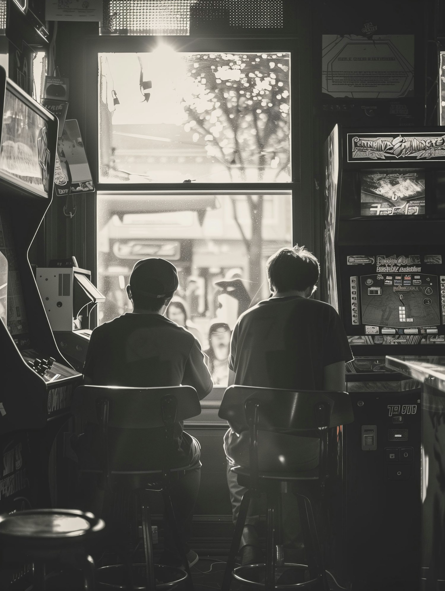 Two people sit in an arcade, backlit by a window, surrounded by vintage arcade machines in a nostalgic black and white setting.