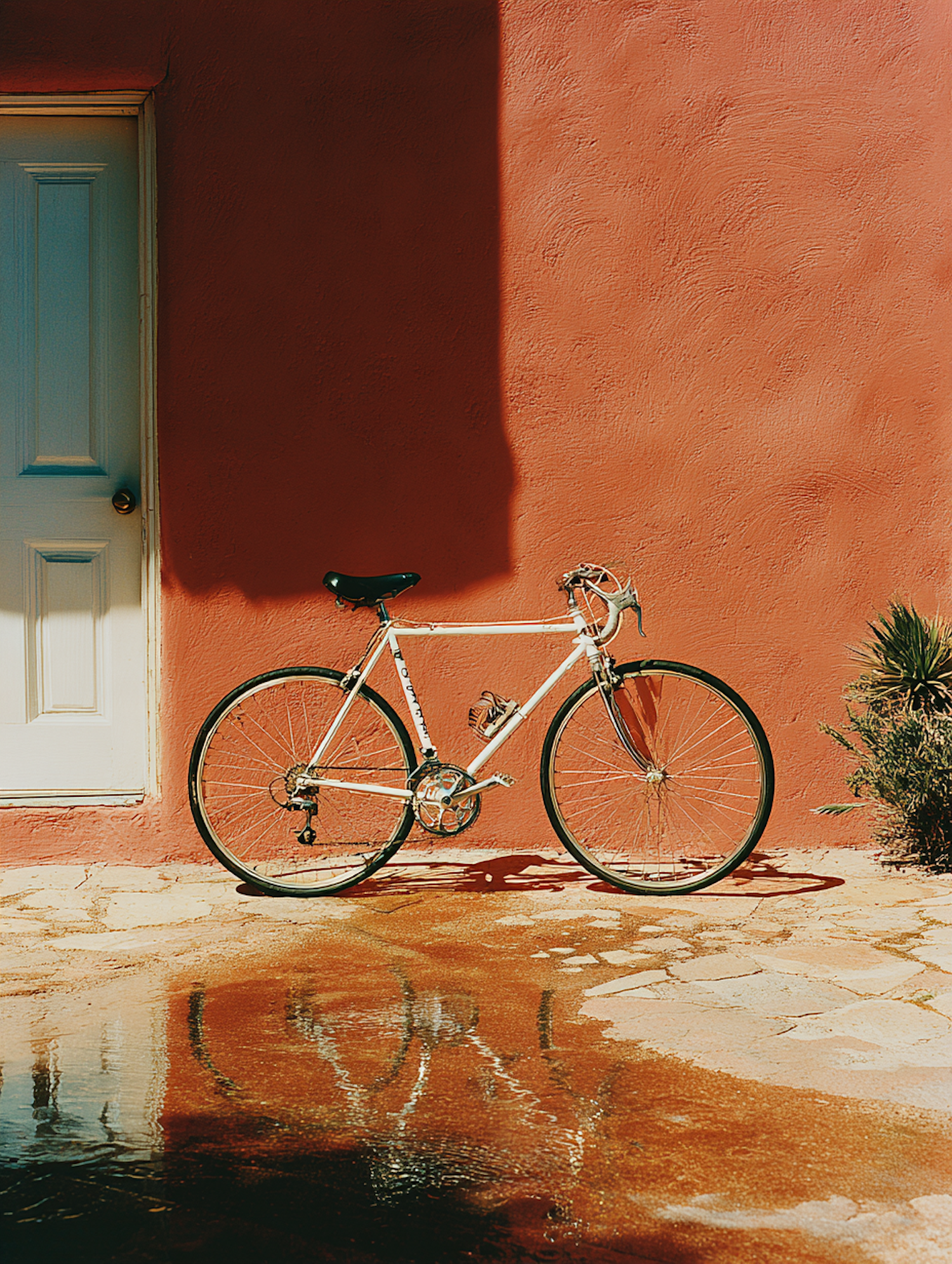 A white vintage bicycle leans against a terracotta wall with a puddle reflecting the scene, creating a warm and nostalgic atmosphere.