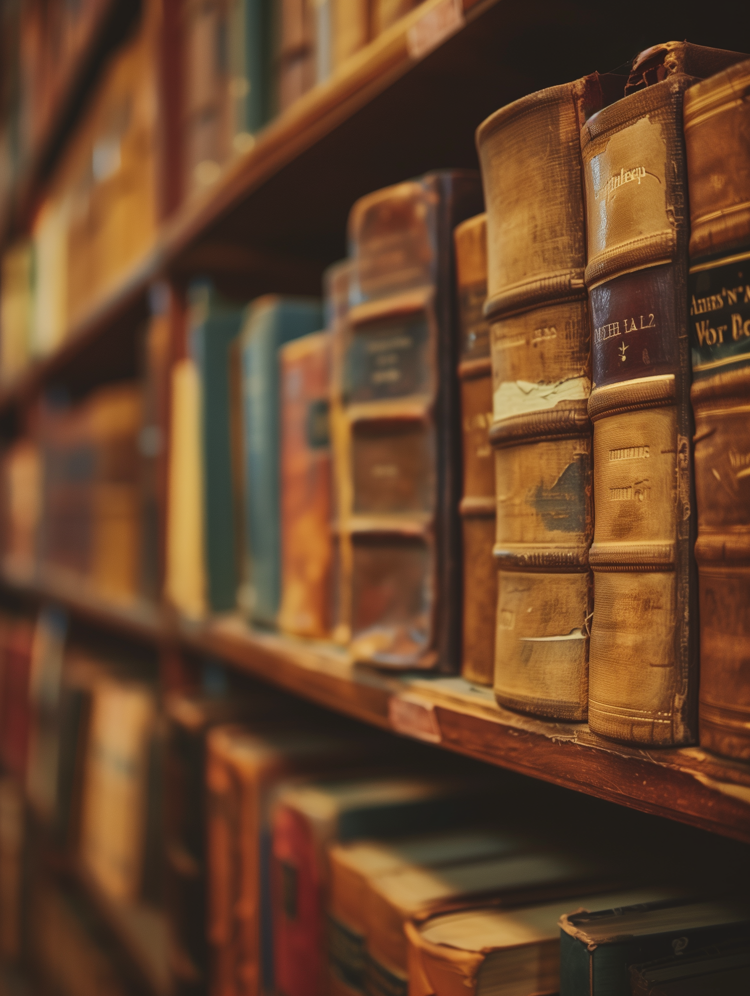 Close-up of a library shelf with old leather-bound books, showcasing their aged spines and faded gold lettering.