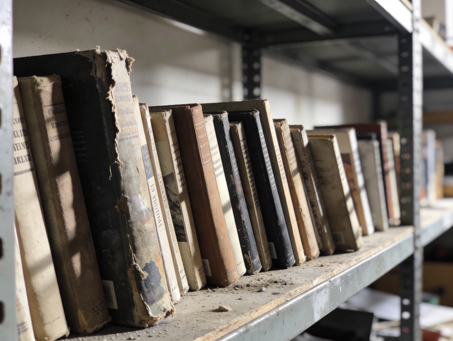 A dusty shelf filled with old, worn books with aged covers, creating a nostalgic and vintage atmosphere.