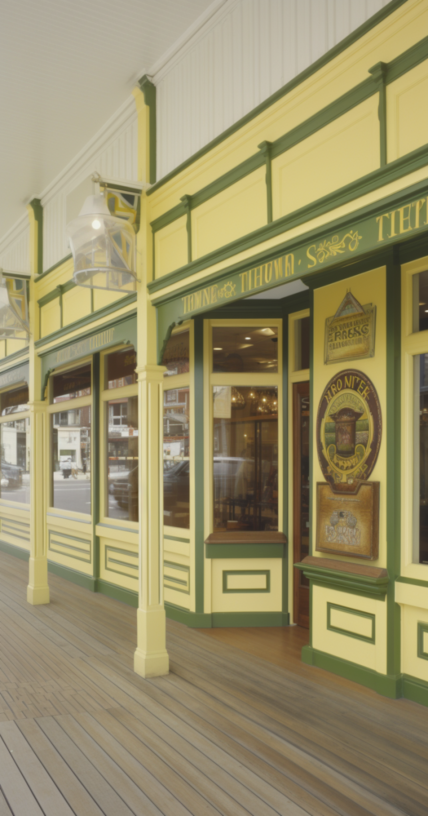Charming vintage storefront with yellow and green facade, classic signage, and large windows in a lively urban setting.