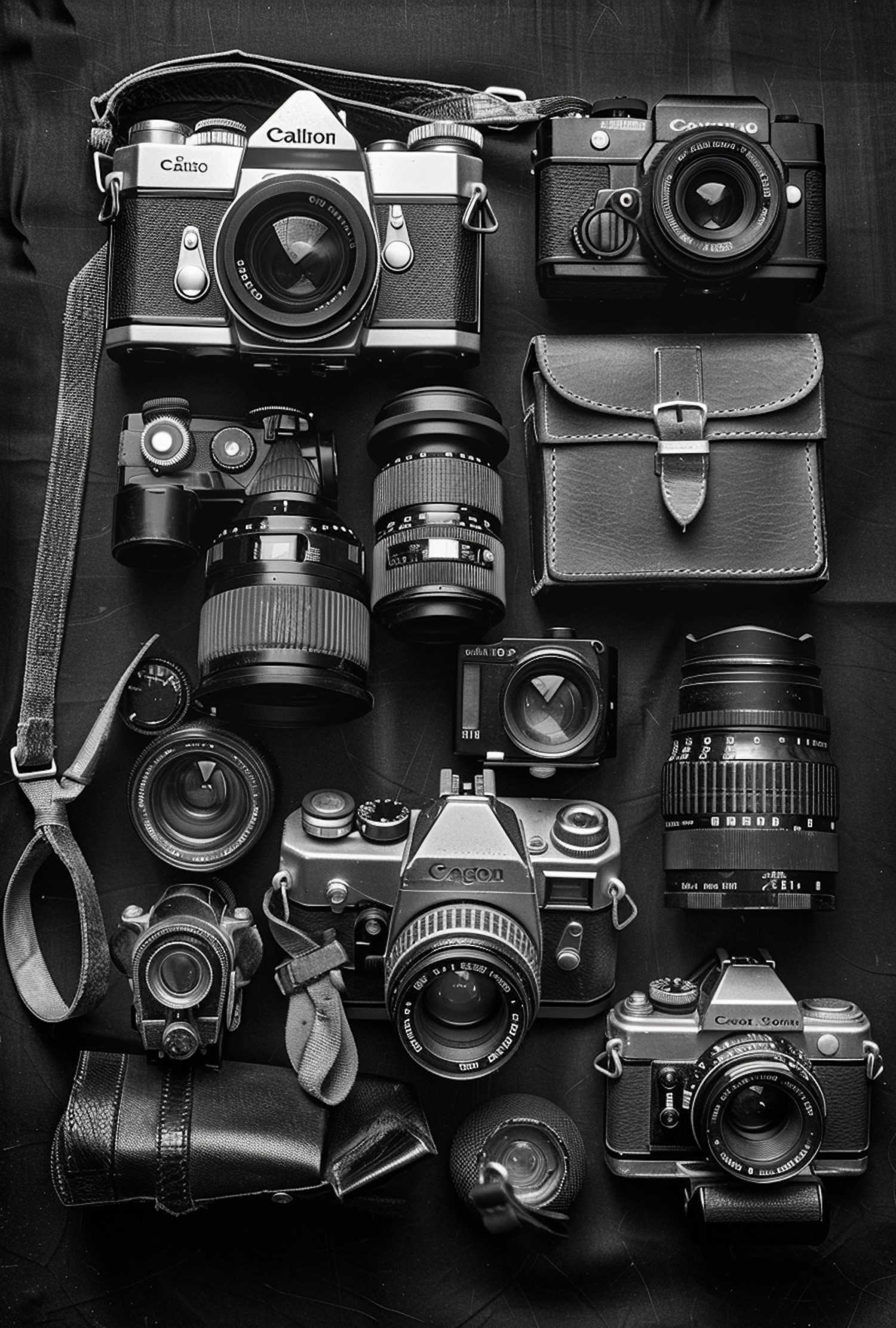 Vintage cameras and lenses artfully arranged on a dark background, showcasing classic designs and a nostalgic monochrome aesthetic.