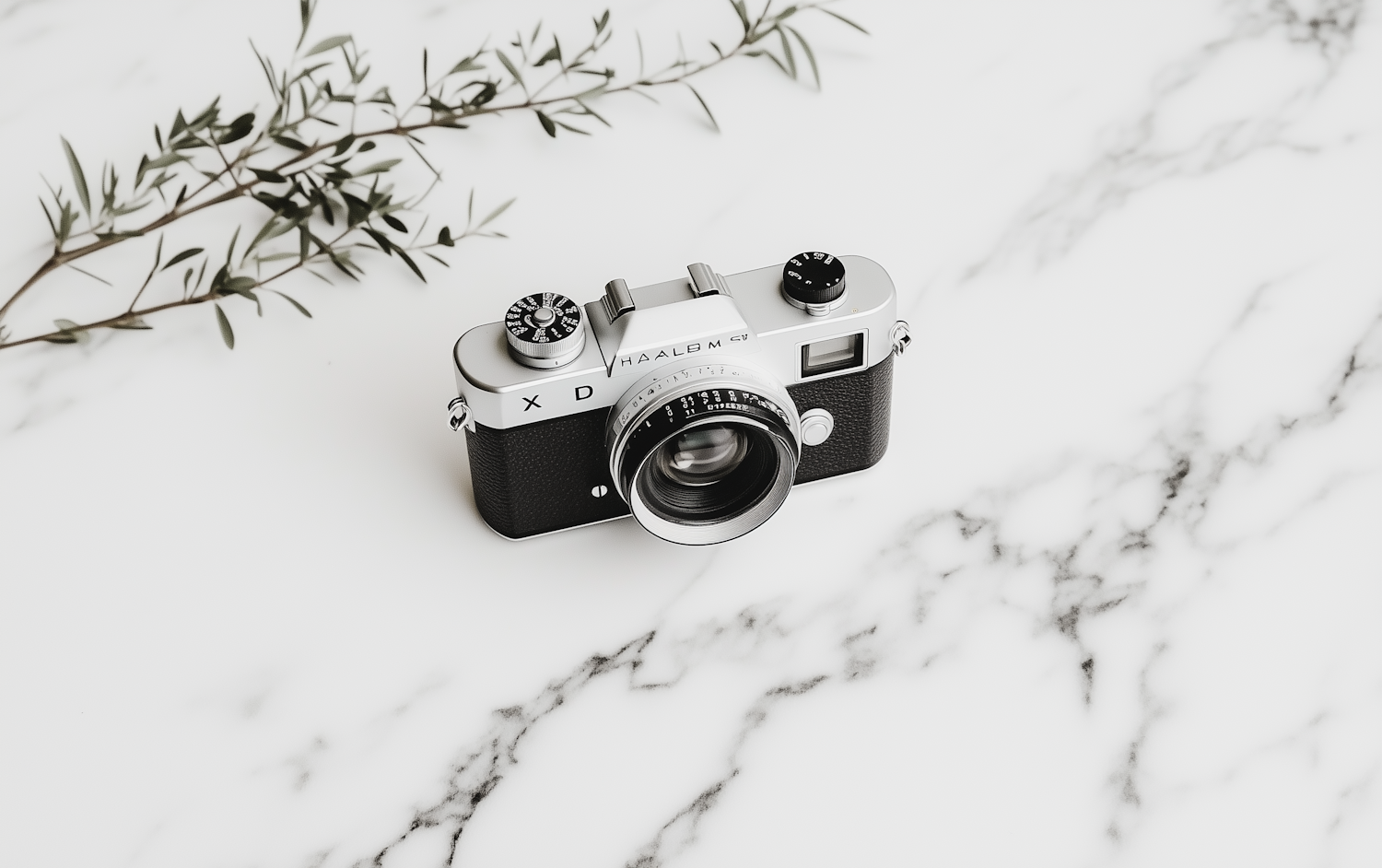 Minimalist shot of a vintage-style silver and black camera on a marble surface with greenery for a retro yet modern aesthetic.