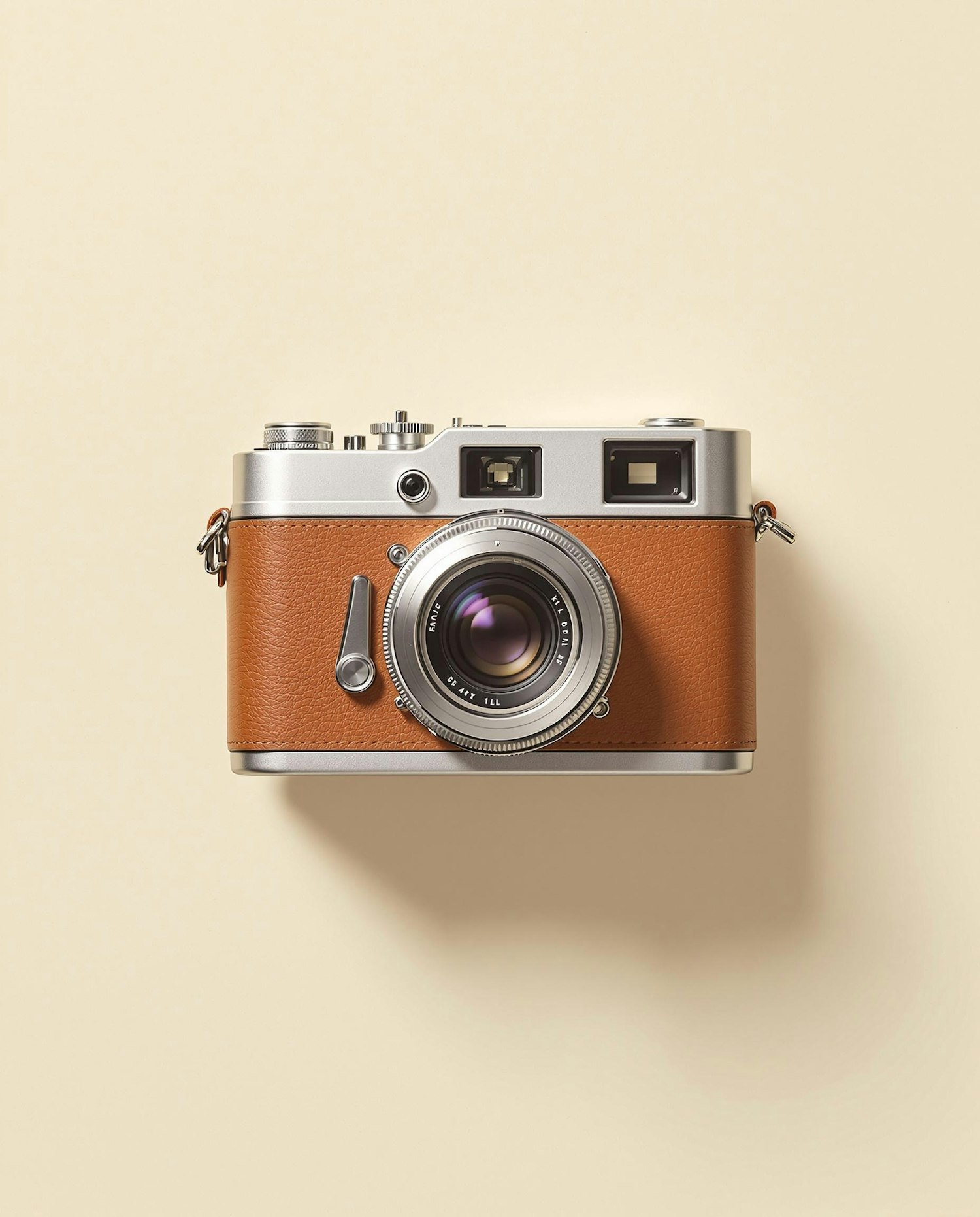 Stylish retro camera with brown leather and silver accents, presented on a beige background, highlighting its vintage design.