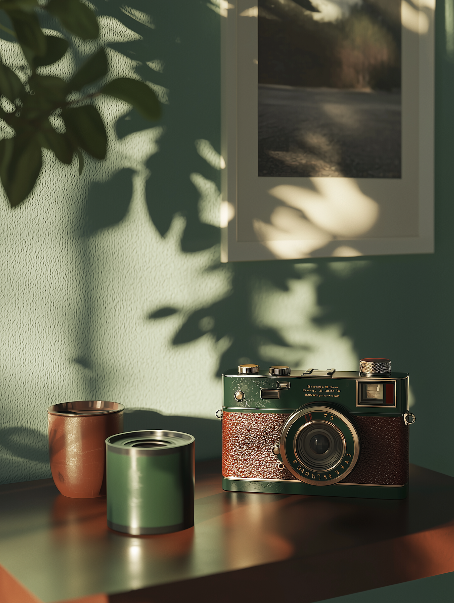 Vintage green and brown camera on a wooden table with a film canister and cup, set against a textured green wall with leafy shadows.