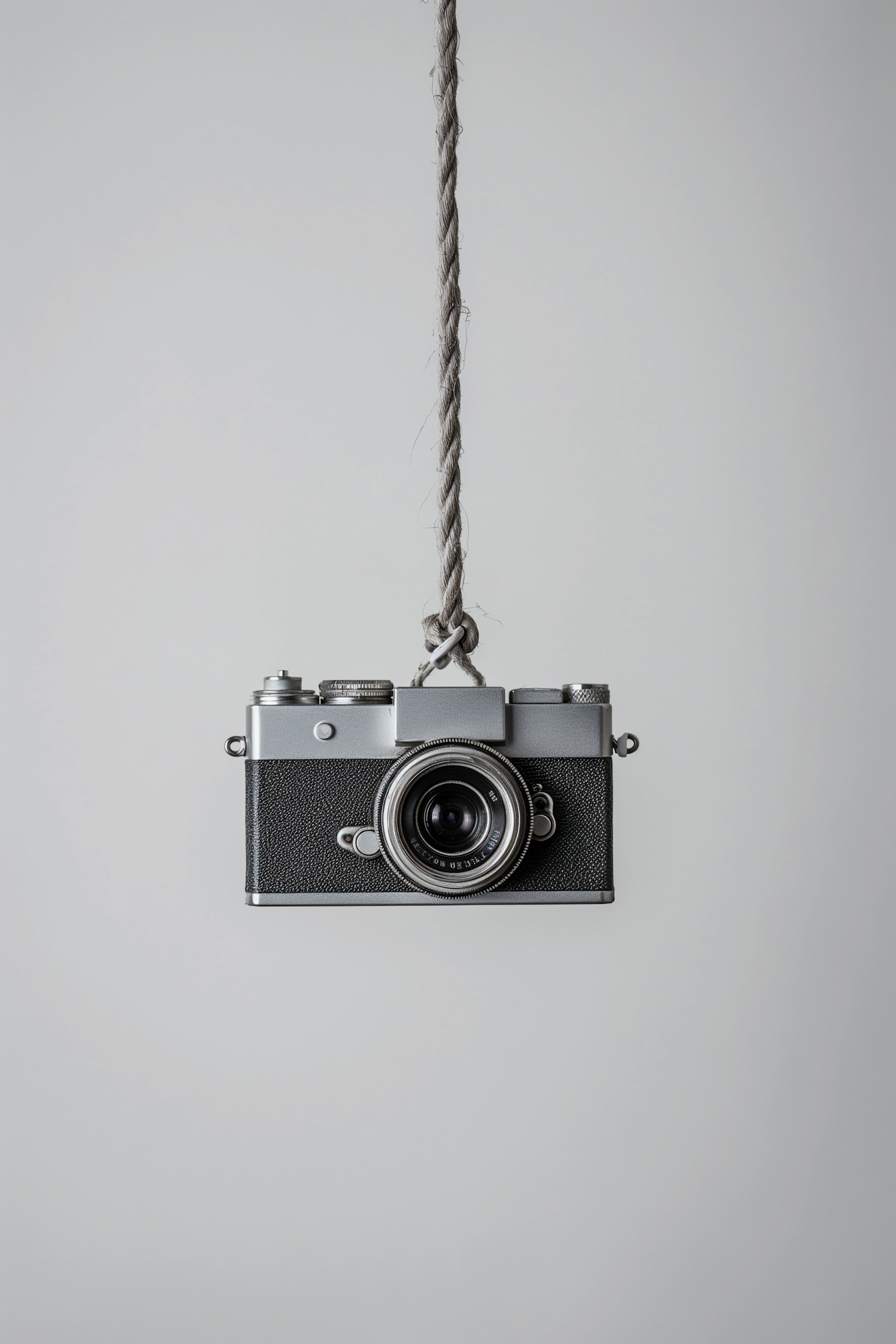 Vintage camera hanging from a rope against a minimalist gray background, showcasing classic design and artistic composition.