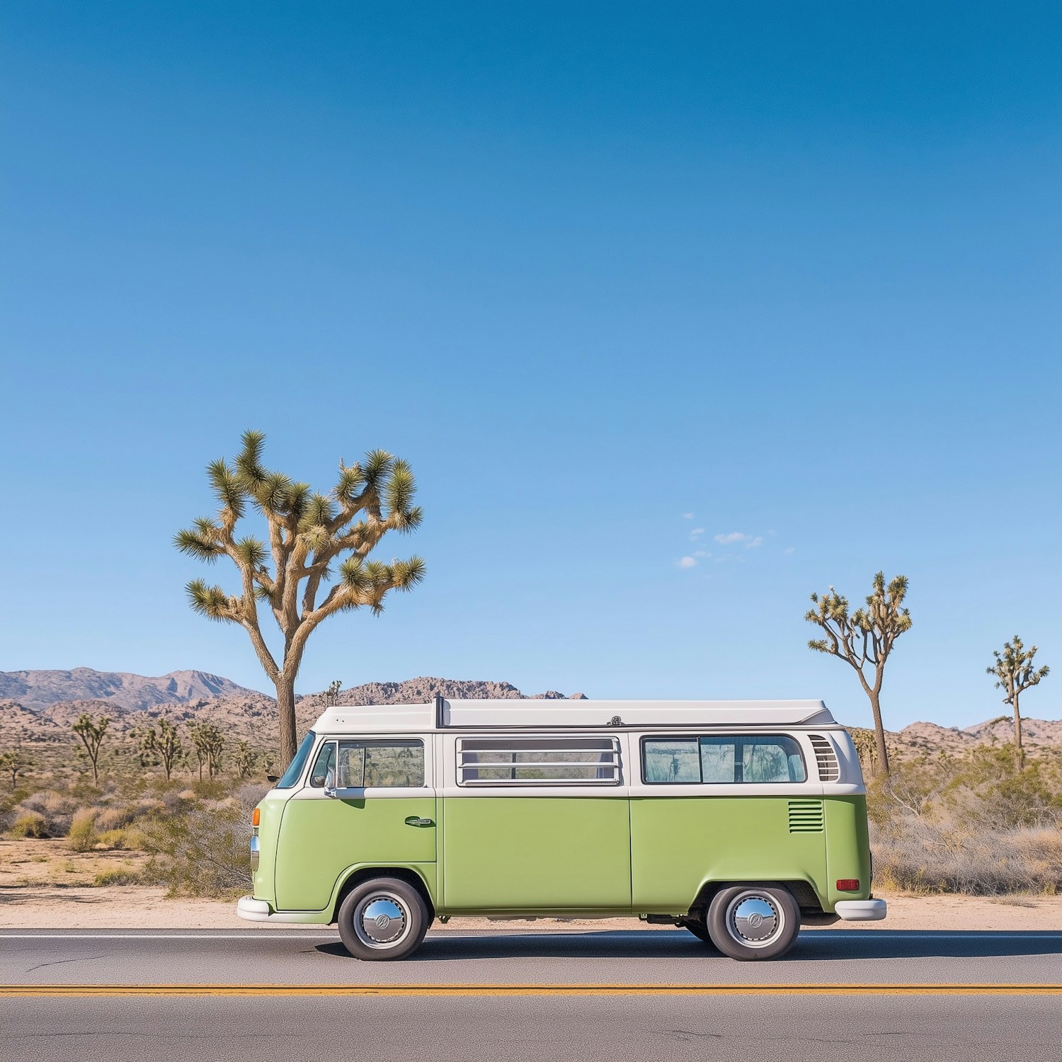 Retro green camper van on a desert road with Joshua trees and mountains under a clear blue sky. Perfect road trip vibes!