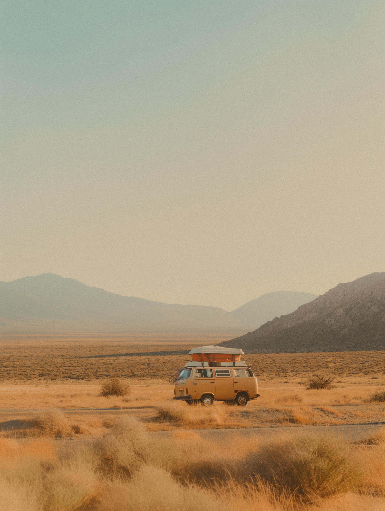 A vintage yellow camper van parked in a golden desert landscape with mountains in the distance, evoking a sense of adventure and serenity.
