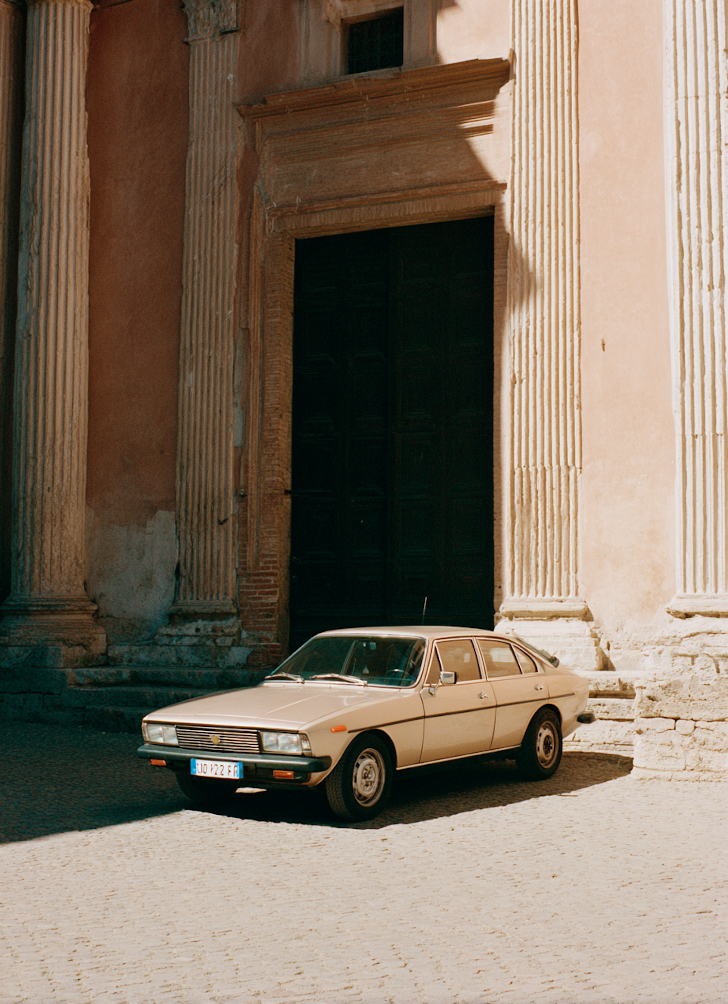 Classic beige car parked in front of a historic building with tall columns and a large wooden door, bathed in warm sunlight.