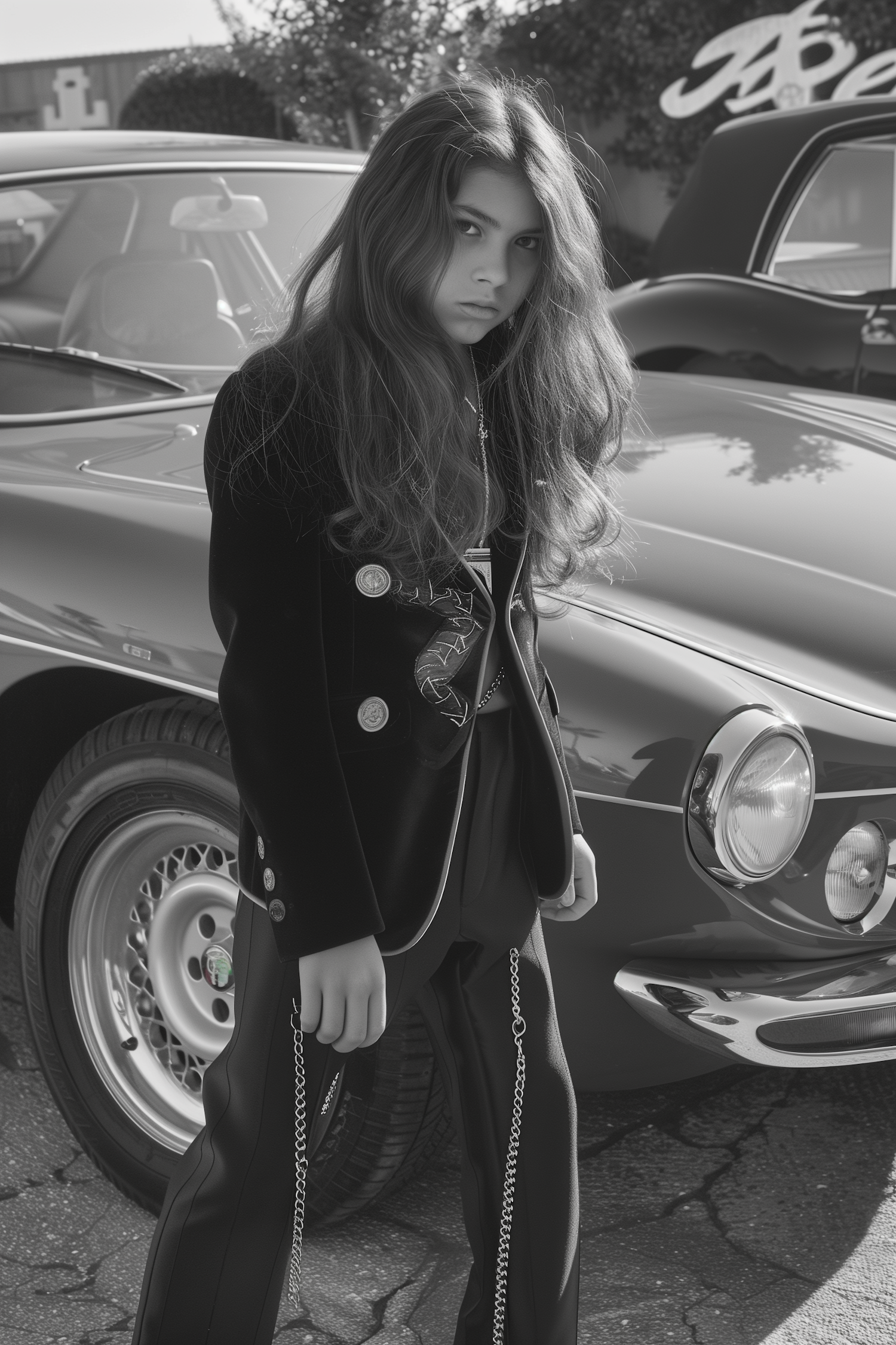 Black-and-white photo of a stylish girl in a tailored outfit posing confidently in front of a vintage car with a polished finish.