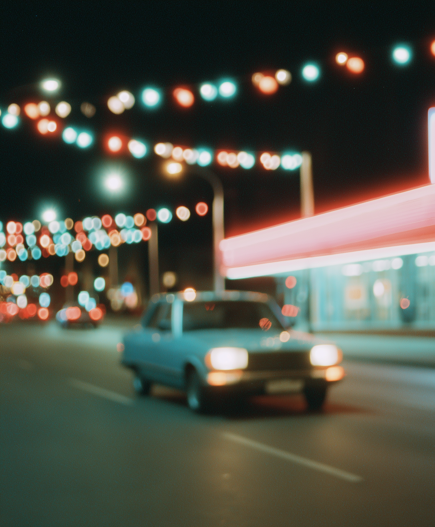 A vintage car on a neon-lit street at night, surrounded by colorful string lights, creating a nostalgic and festive urban atmosphere.
