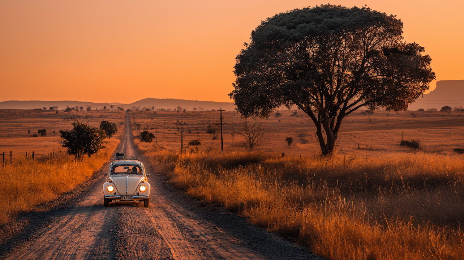 A vintage white car on a dirt road at sunset, surrounded by golden grasslands and a large tree, creating a serene and nostalgic scene.