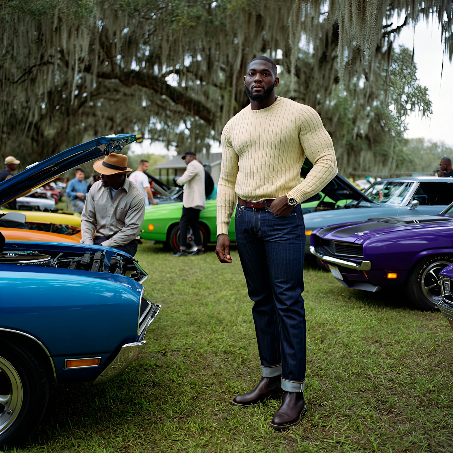 A man stands amongst vibrant vintage cars during an outdoor car show, interacting with enthusiasts in a picturesque moss-covered setting.