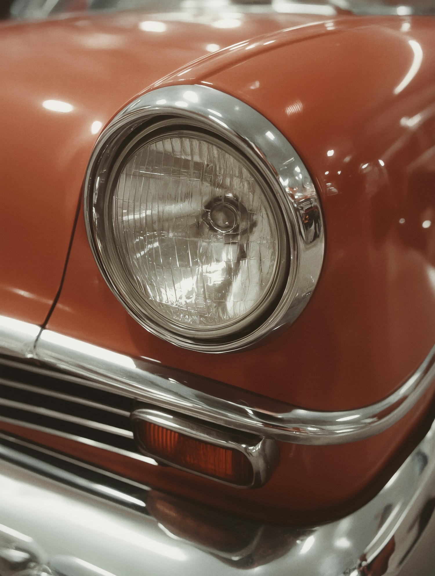 Close-up of a vintage car's red body and chrome-trimmed headlight, showcasing its classic design and retro aesthetic.