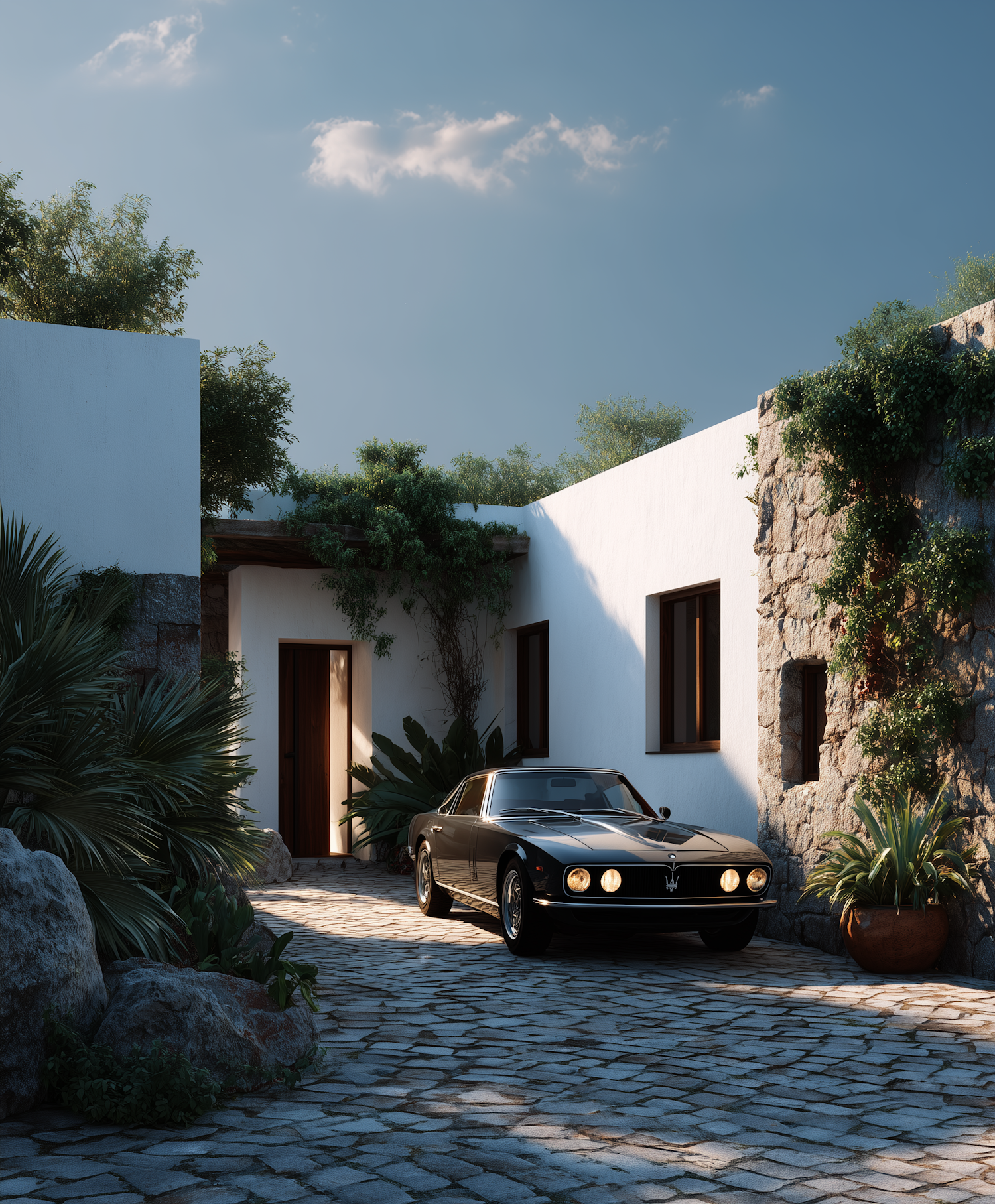 A classic black car parked in a Mediterranean-style courtyard with white walls, stone accents, and lush greenery under a clear sky.