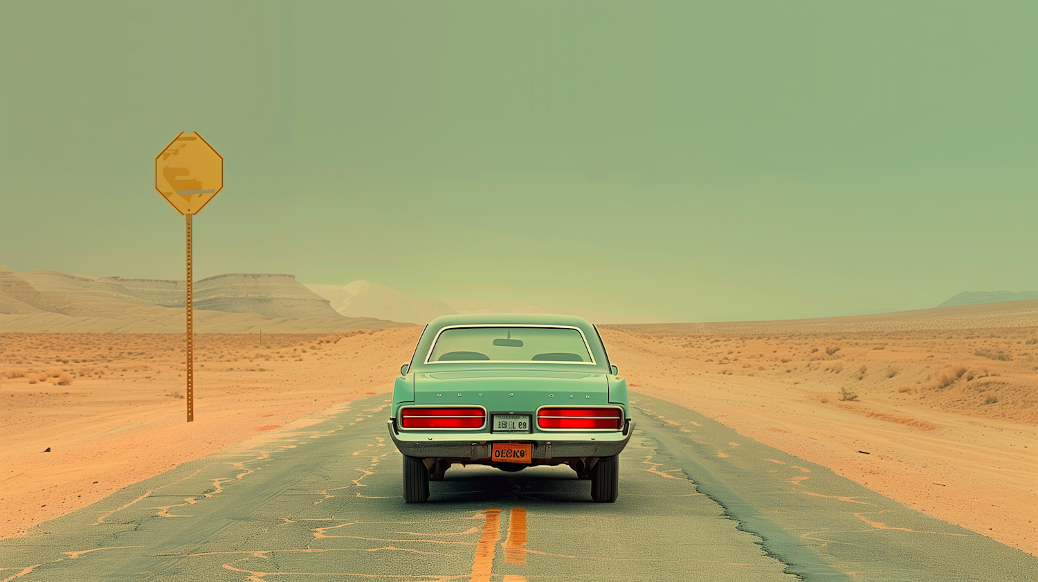 Vintage mint green car on a deserted road in a barren desert, with a faded yellow road sign under a pale green sky.