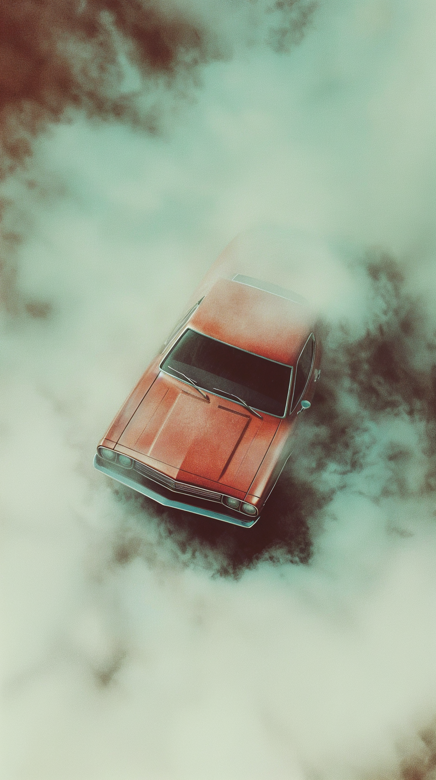 A vintage red car surrounded by fog, creating a mysterious and ethereal atmosphere with a nostalgic feel.