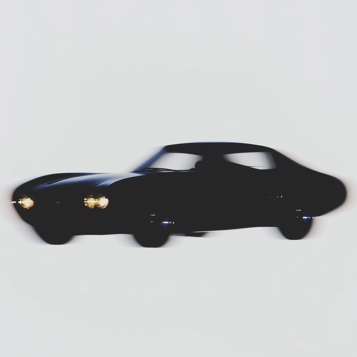 Silhouetted vintage car in motion with glowing headlights against a white background, creating a dynamic and mysterious vibe.