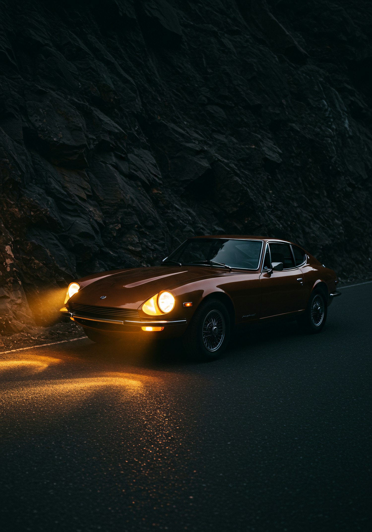 A classic brown vintage car with glowing headlights parked on a dark road by a rocky cliff, creating a dramatic and nostalgic scene.