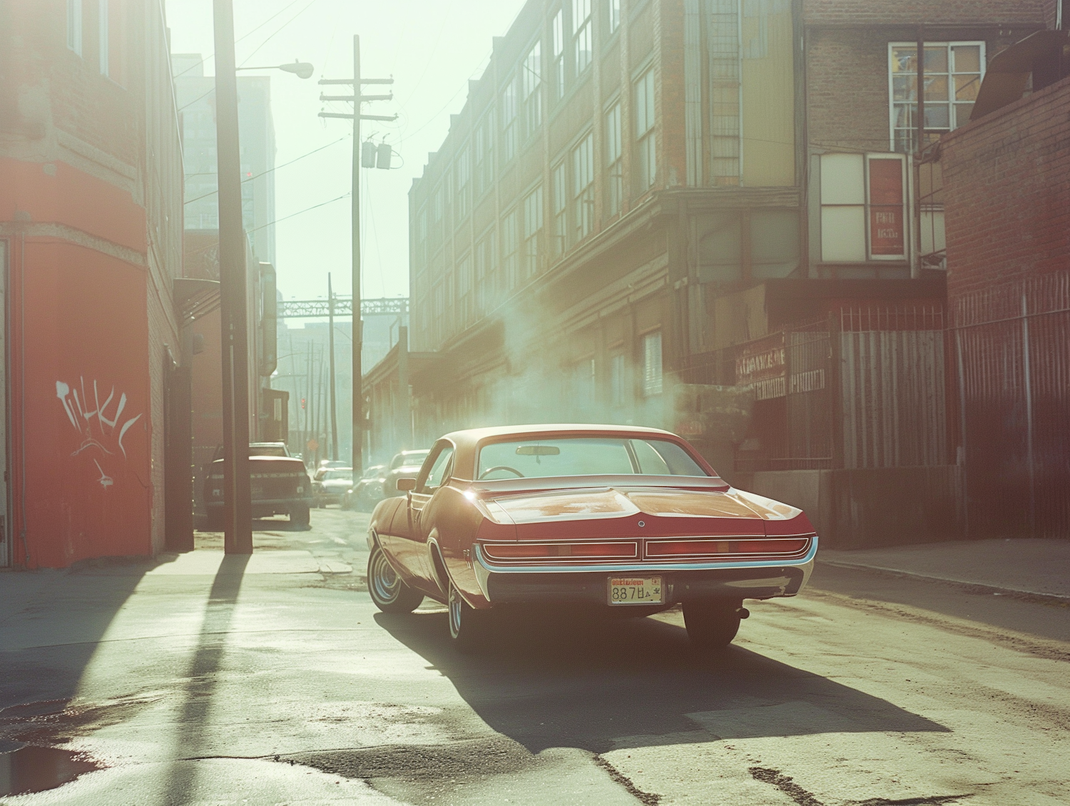 Vintage red car in a sunlit urban alley, surrounded by brick buildings and utility poles, creating a nostalgic, misty atmosphere.