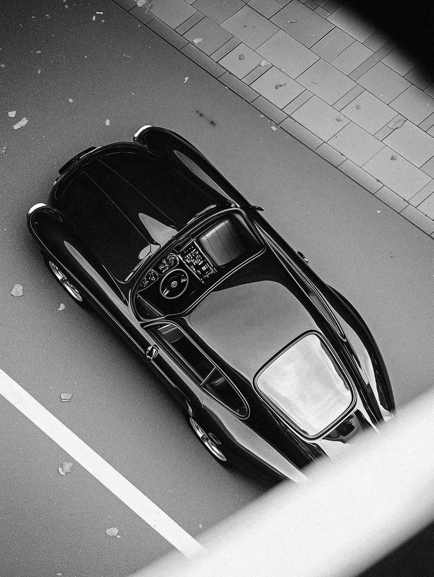 Overhead view of a classic vintage car in black and white, showcasing its sleek design and elegant curves on a paved street.