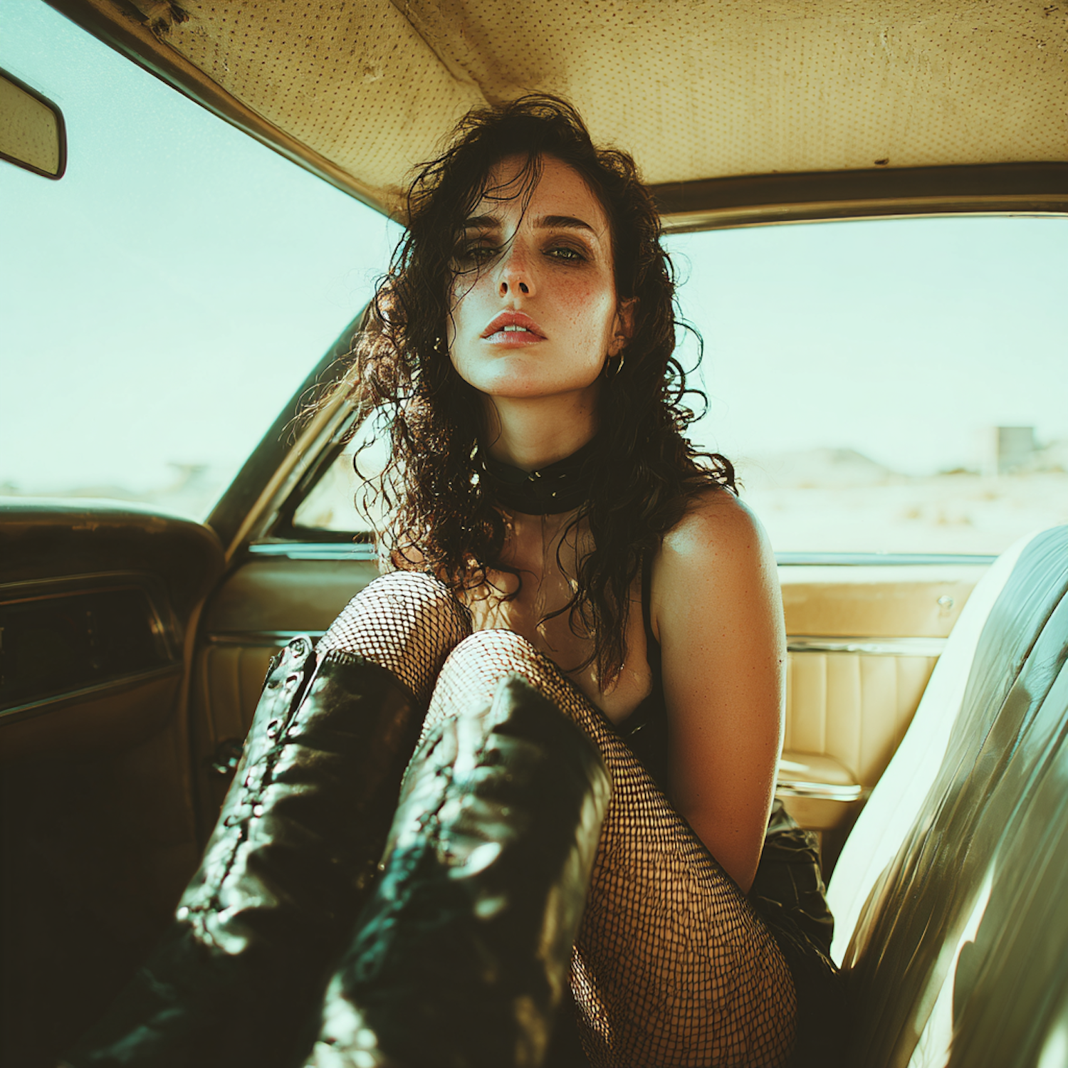 A stylish woman in a vintage car, wearing fishnet stockings and boots, with a desert landscape in the background.
