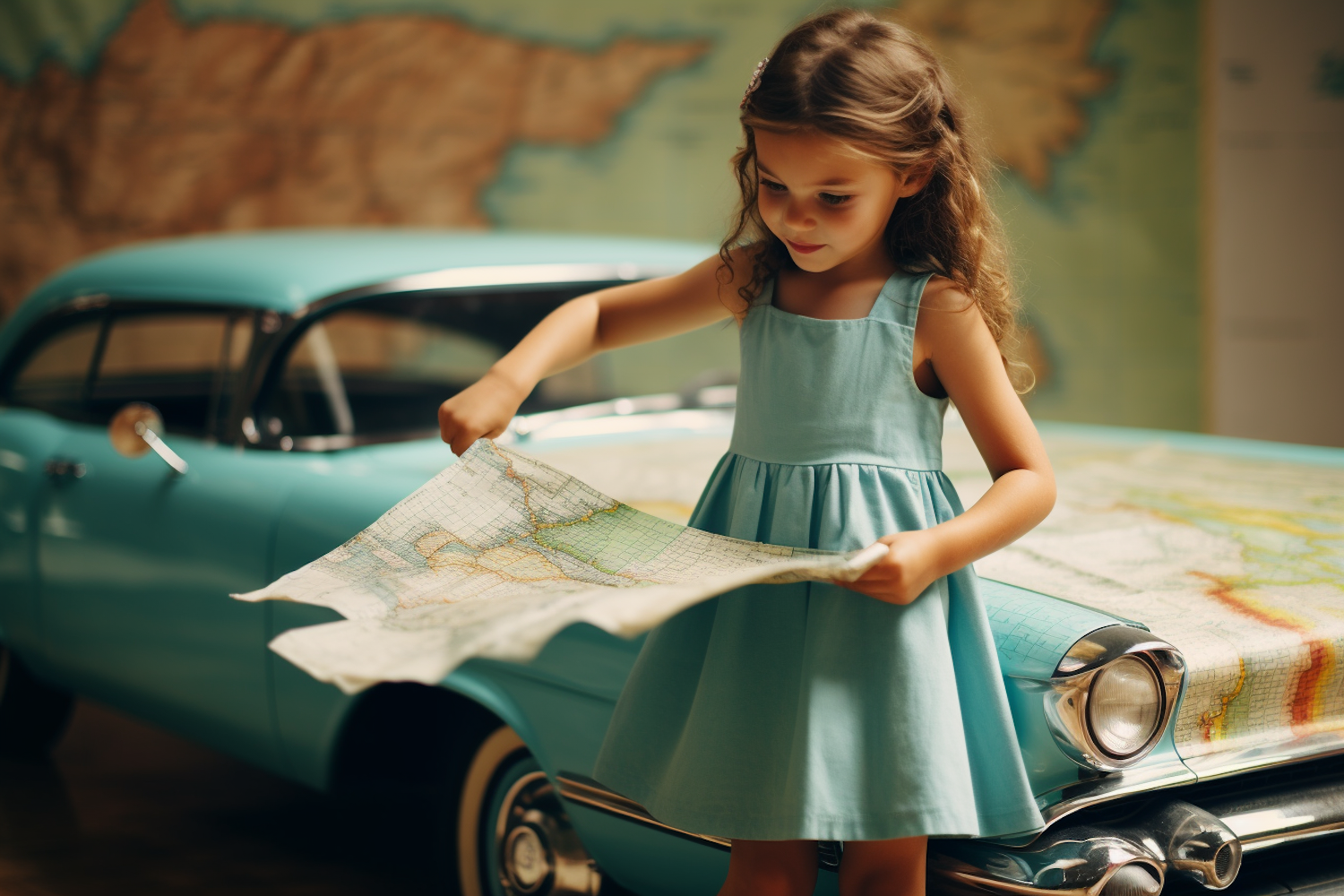 Young girl in turquoise dress studies a map by a vintage turquoise car, evoking a sense of adventure and nostalgia.