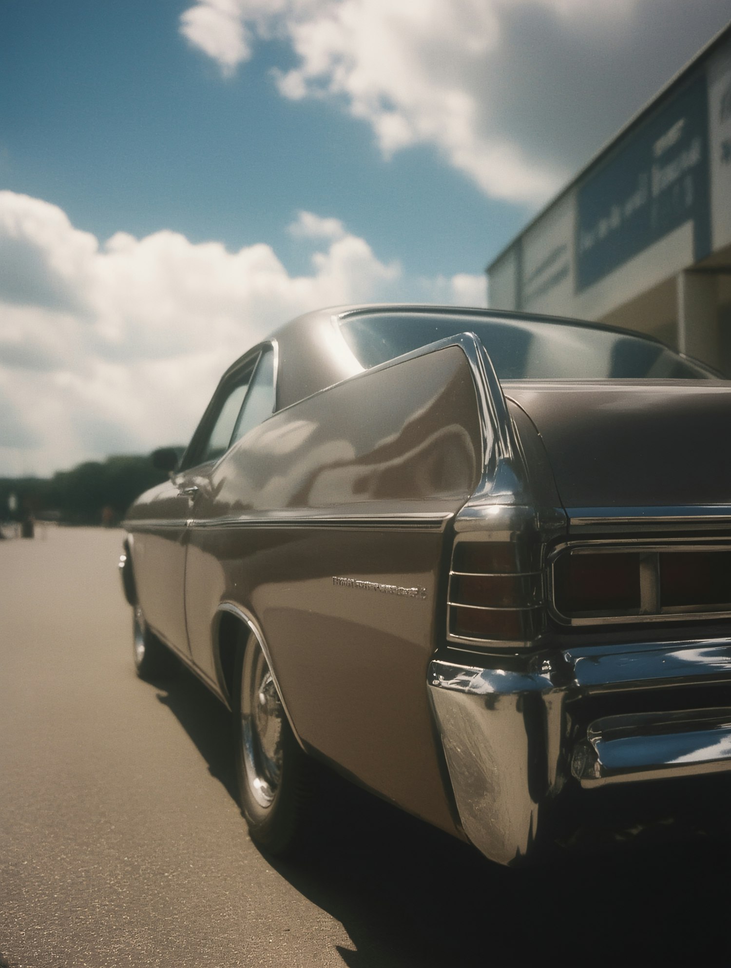 Classic vintage car with a polished metallic finish under a sunny sky, showcasing its elegant rear design and chrome details.