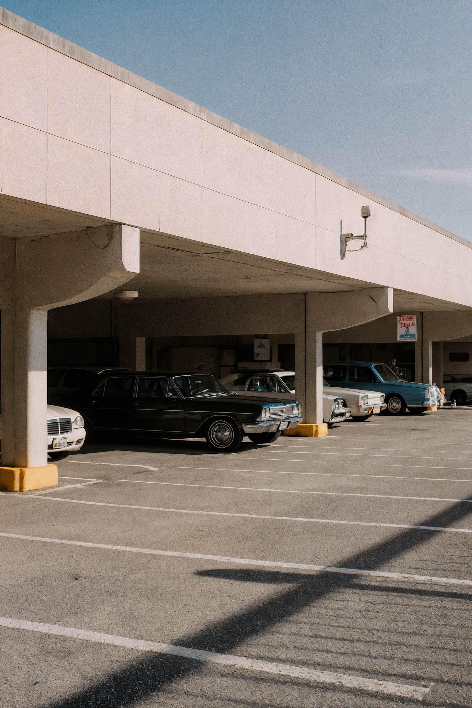A parking lot with vintage cars under a concrete structure, featuring a black classic sedan and a clear blue sky in the background.