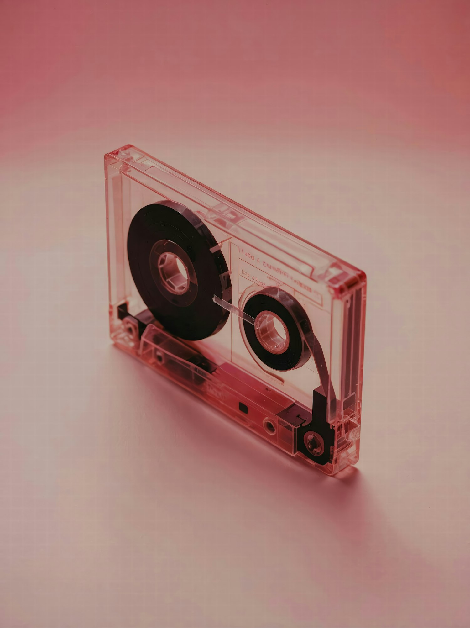 Vintage audio cassette with transparent casing against a pink gradient background, evoking nostalgia and retro vibes.