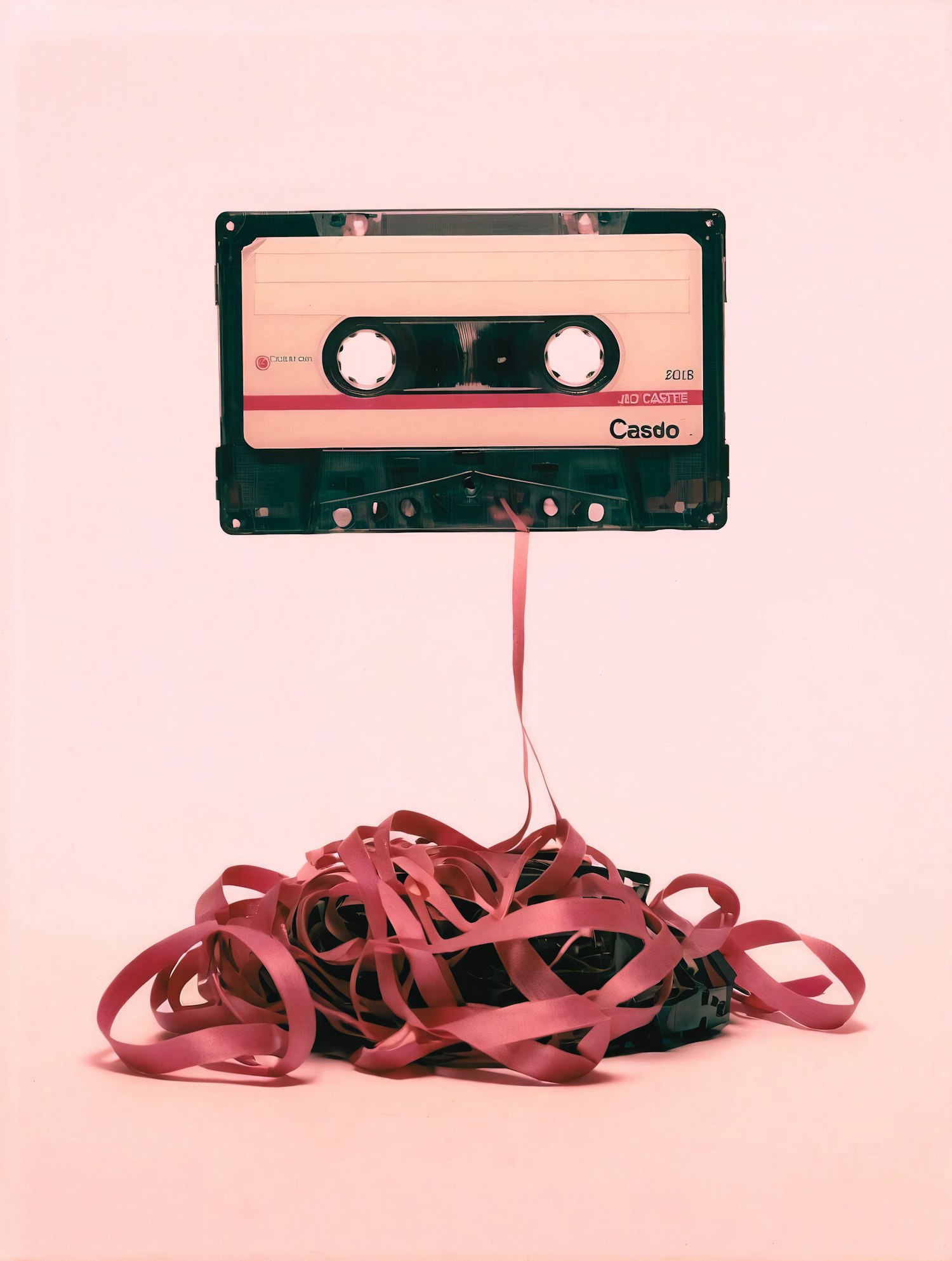 Vintage cassette tape with pink ribbon tangled below, set against a soft pink background, evoking retro nostalgia.
