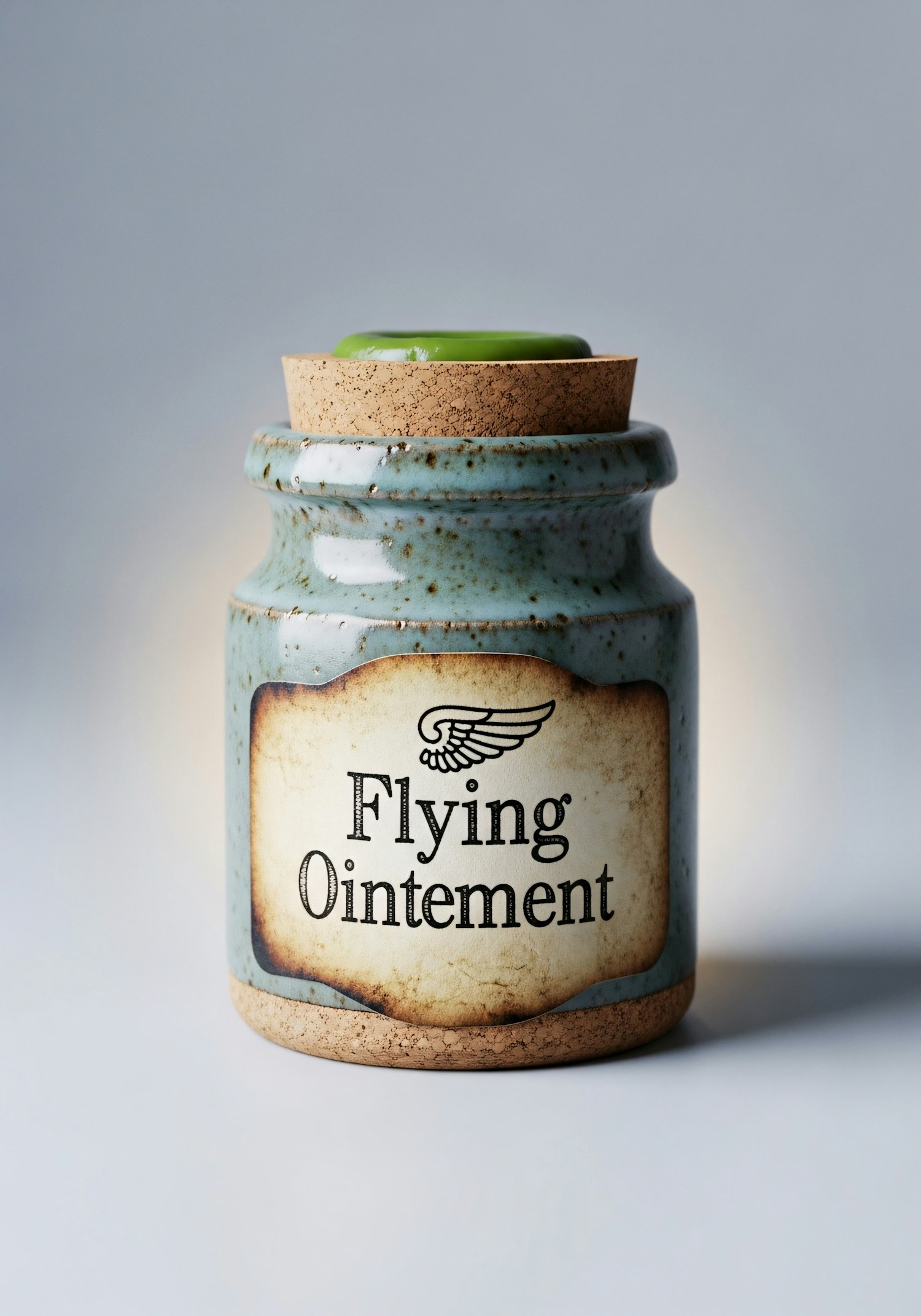 A vintage-style ceramic jar labeled 'Flying Ointment' with a cork lid and green contents, set against a neutral background.