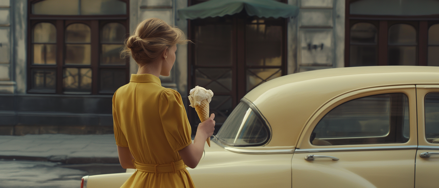 Woman in yellow dress holding ice cream beside vintage yellow car on cobblestone street, with nostalgic urban backdrop.