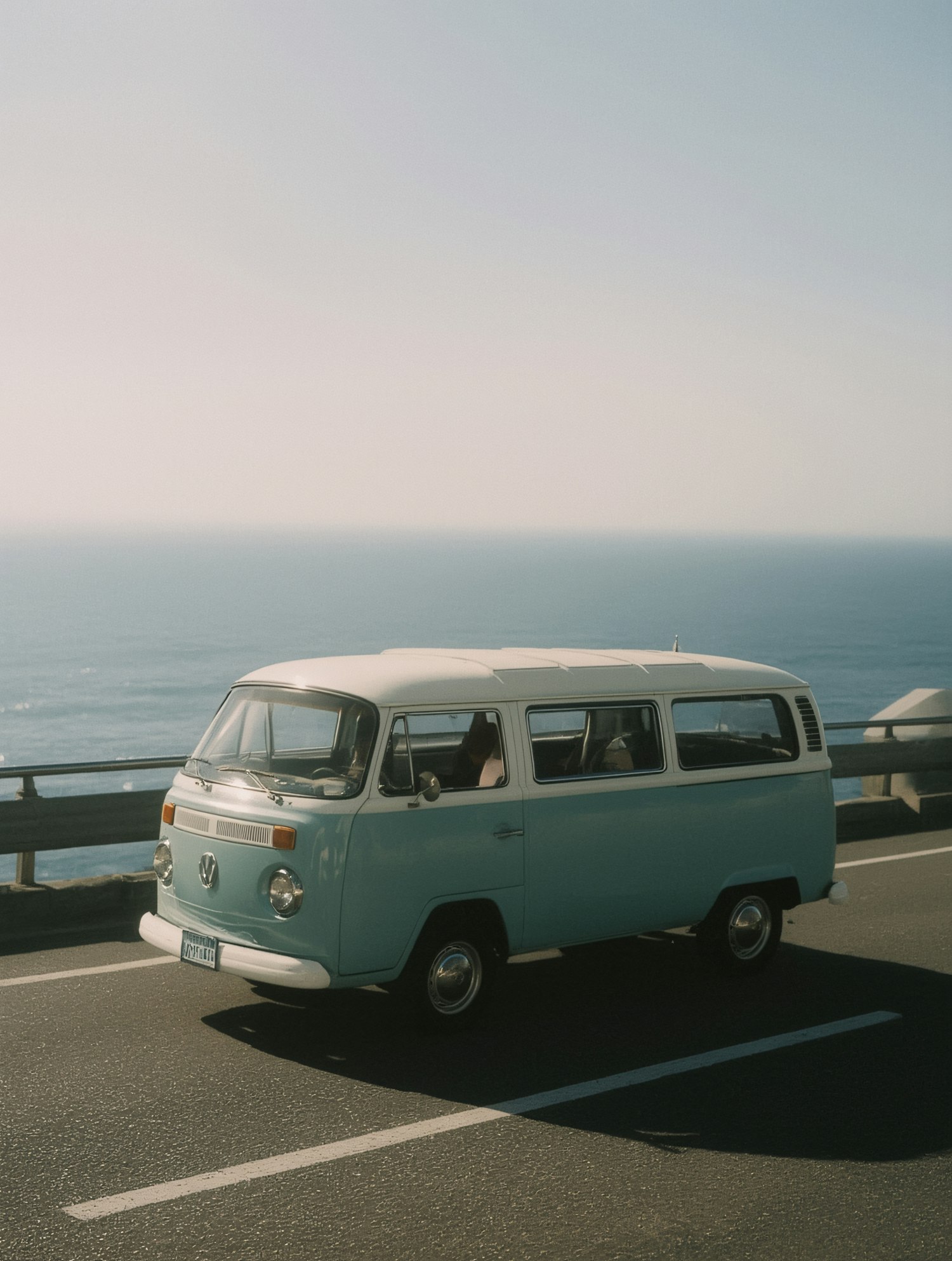 Vintage light blue Volkswagen van parked on a coastal road with a scenic ocean view under a clear, sunny sky.