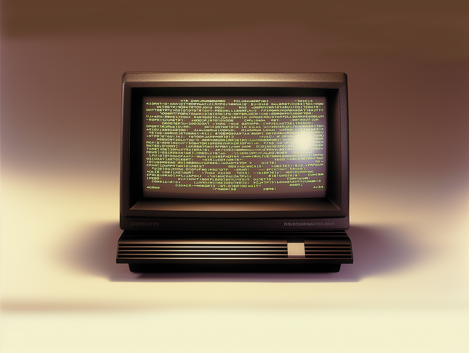 Vintage computer monitor with green text on a black screen, evoking a retro 1980s tech vibe. Warm lighting adds a nostalgic touch.