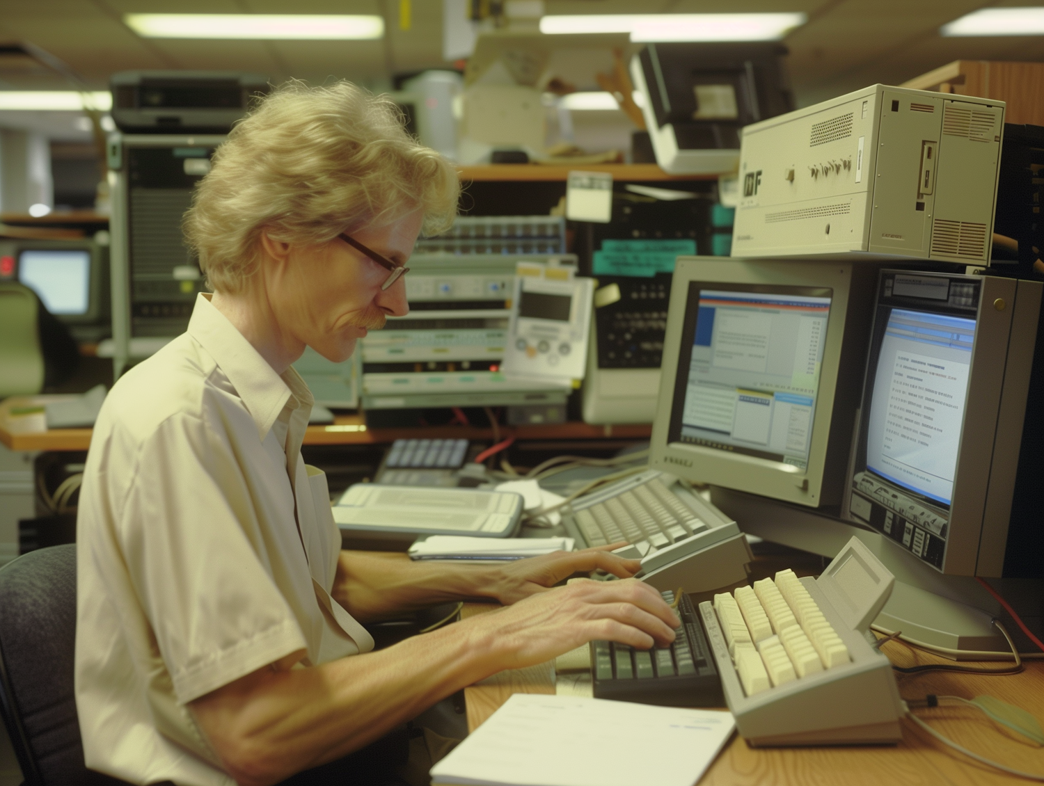 Caucasian man in an office, typing on a vintage keyboard with CRT monitors, surrounded by electronic equipment.