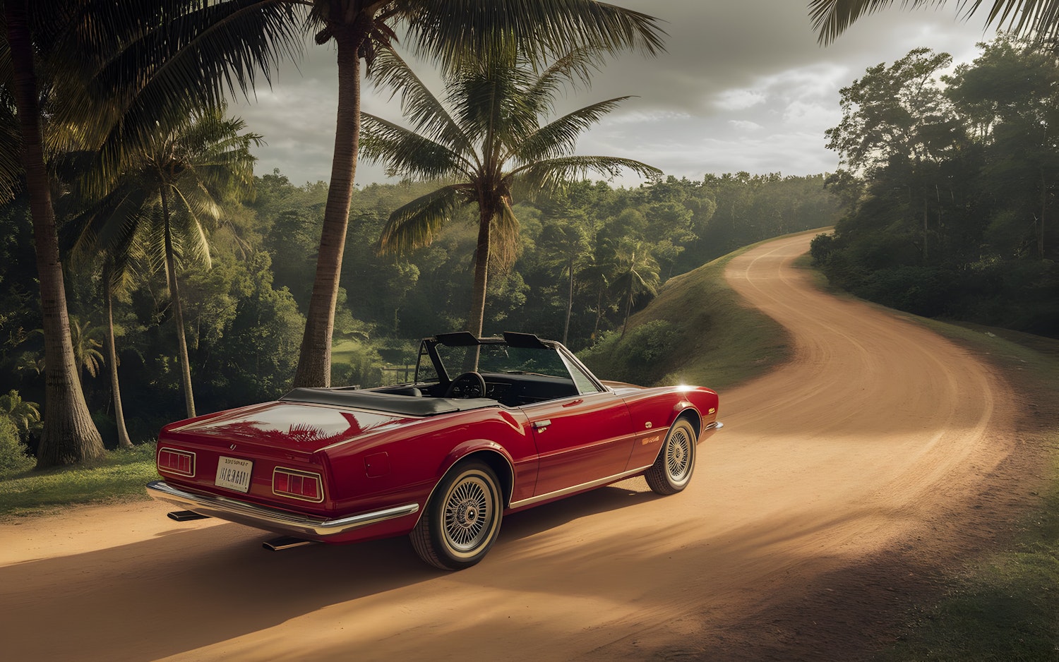 A red vintage convertible on a tropical dirt road, surrounded by lush greenery and palm trees under a partly cloudy sky.