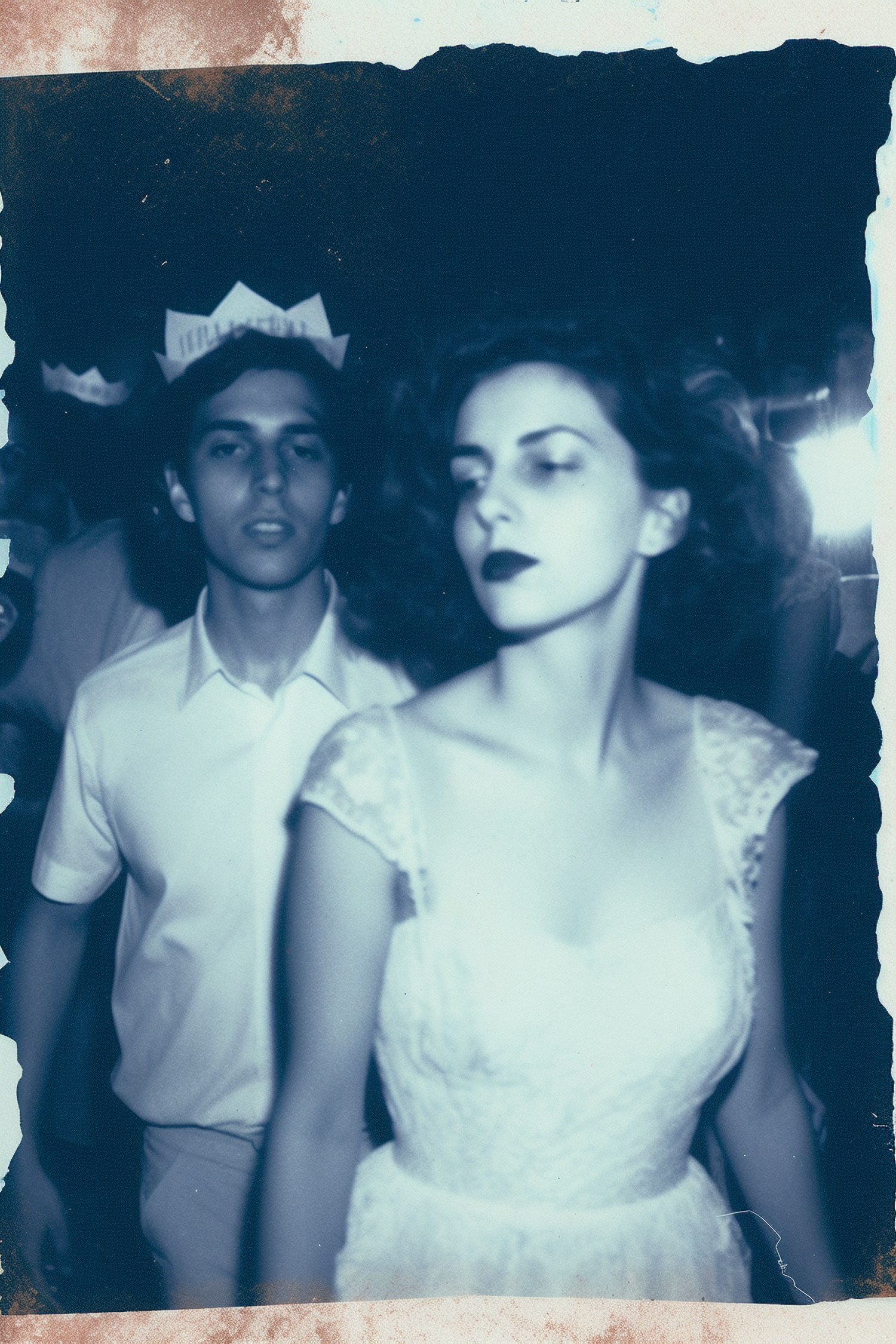 A vintage-style photo of a man and woman in a dimly lit setting, with a nostalgic blue tint and worn edges enhancing the aesthetic.