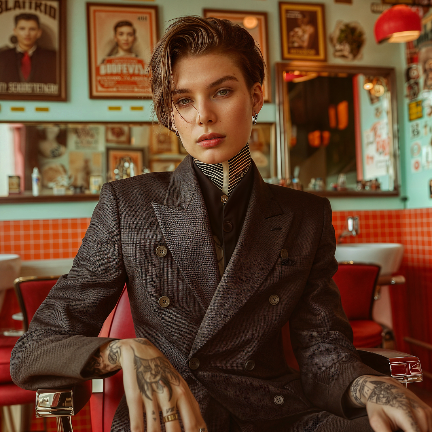 Stylish individual in a vintage barbershop, wearing a gray suit with tattoos and retro decor in the background.