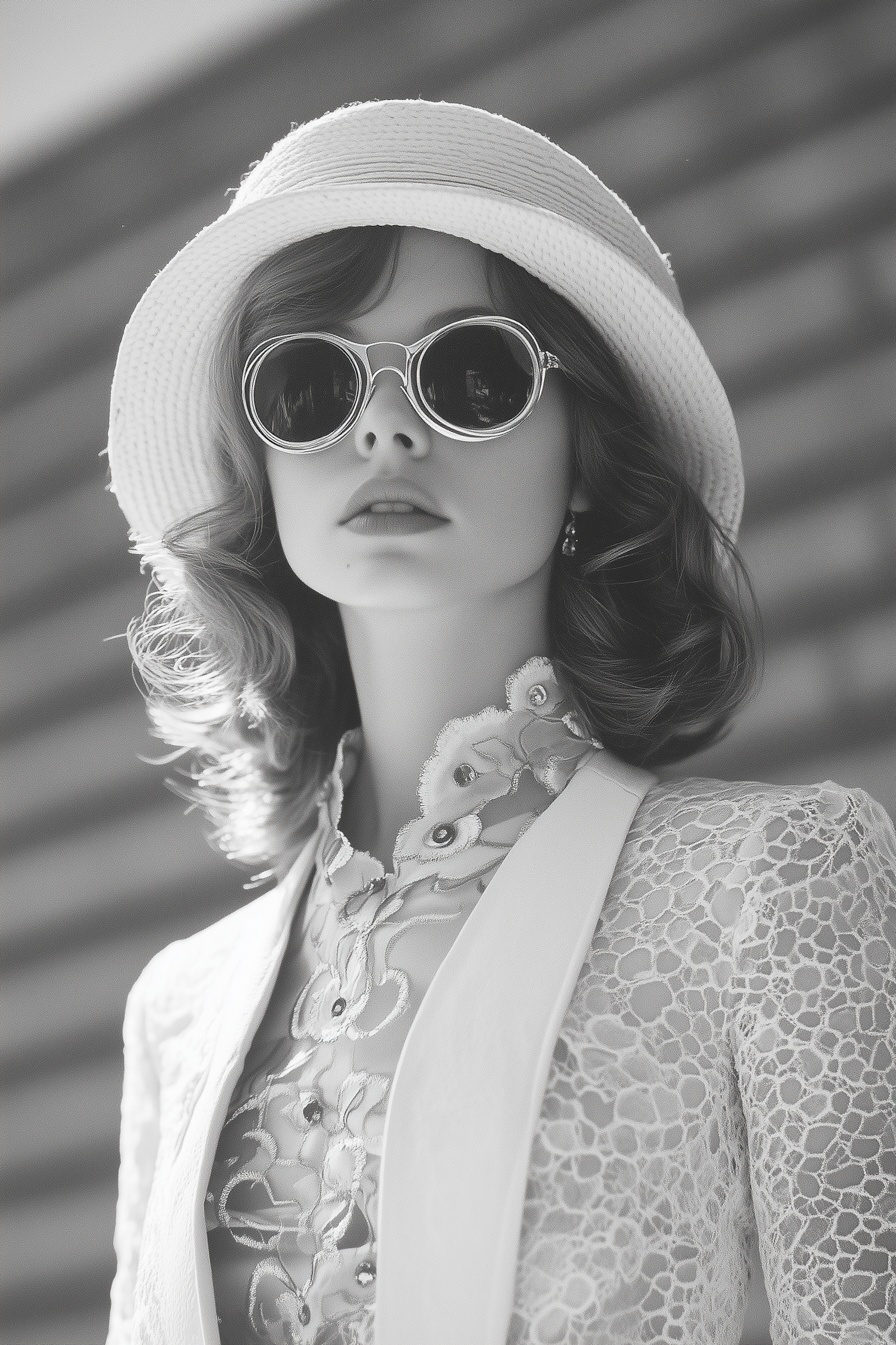 Elegant woman in vintage lace outfit, wide-brimmed hat, and sunglasses. Monochrome style enhances the classic, sophisticated look.