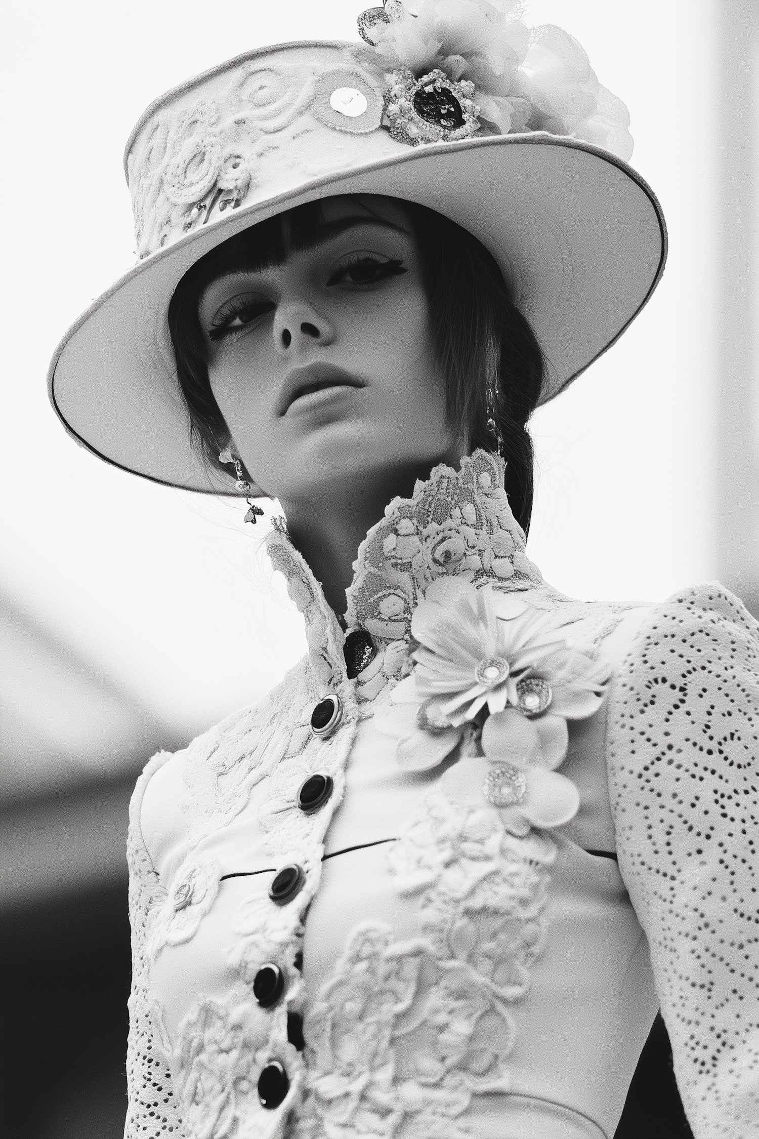 Elegant monochrome portrait of a woman in vintage lace attire and a wide-brimmed hat adorned with floral and jeweled details.