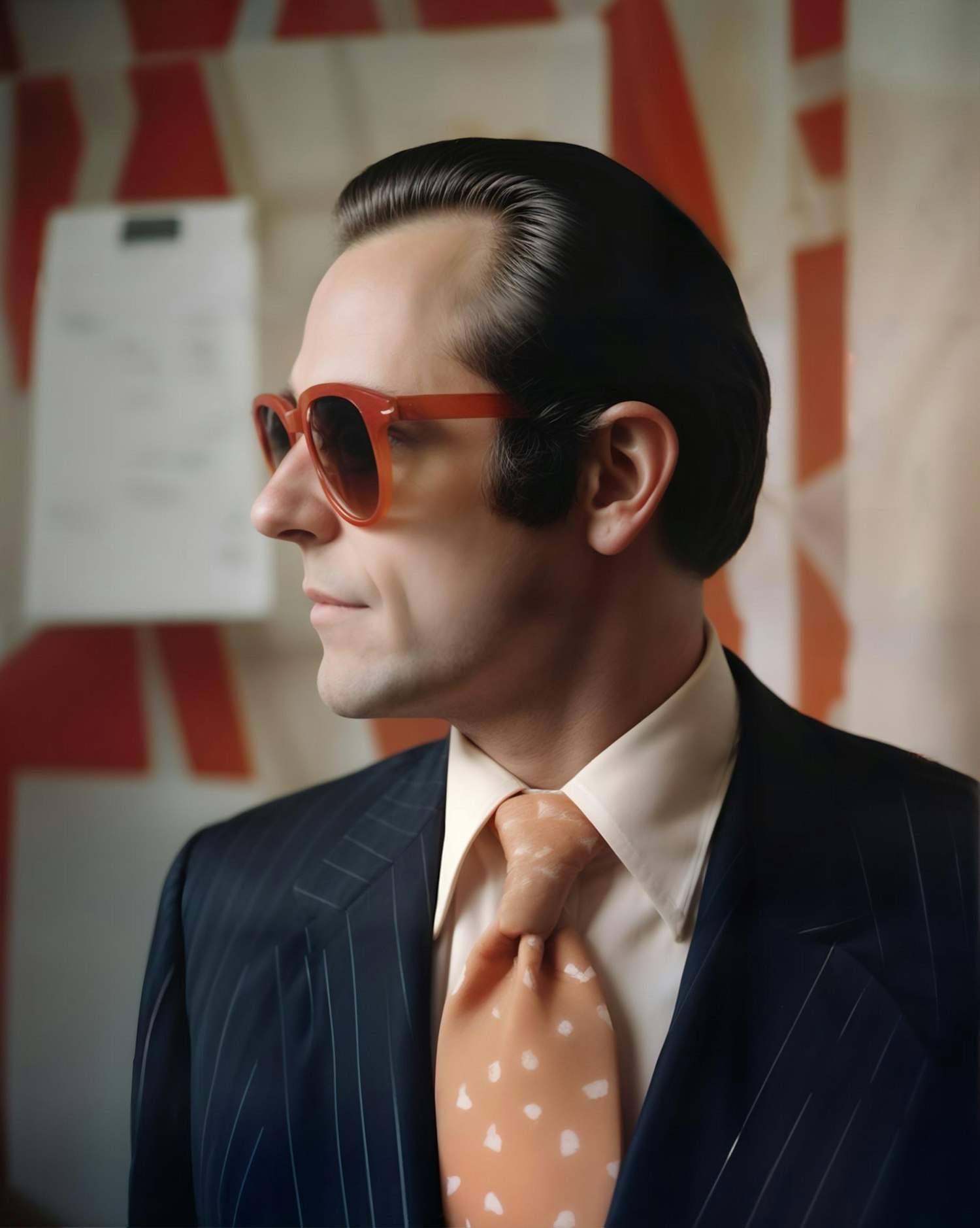 Man in a dark pinstripe suit with a peach polka dot tie, blurred face, abstract red and white background.