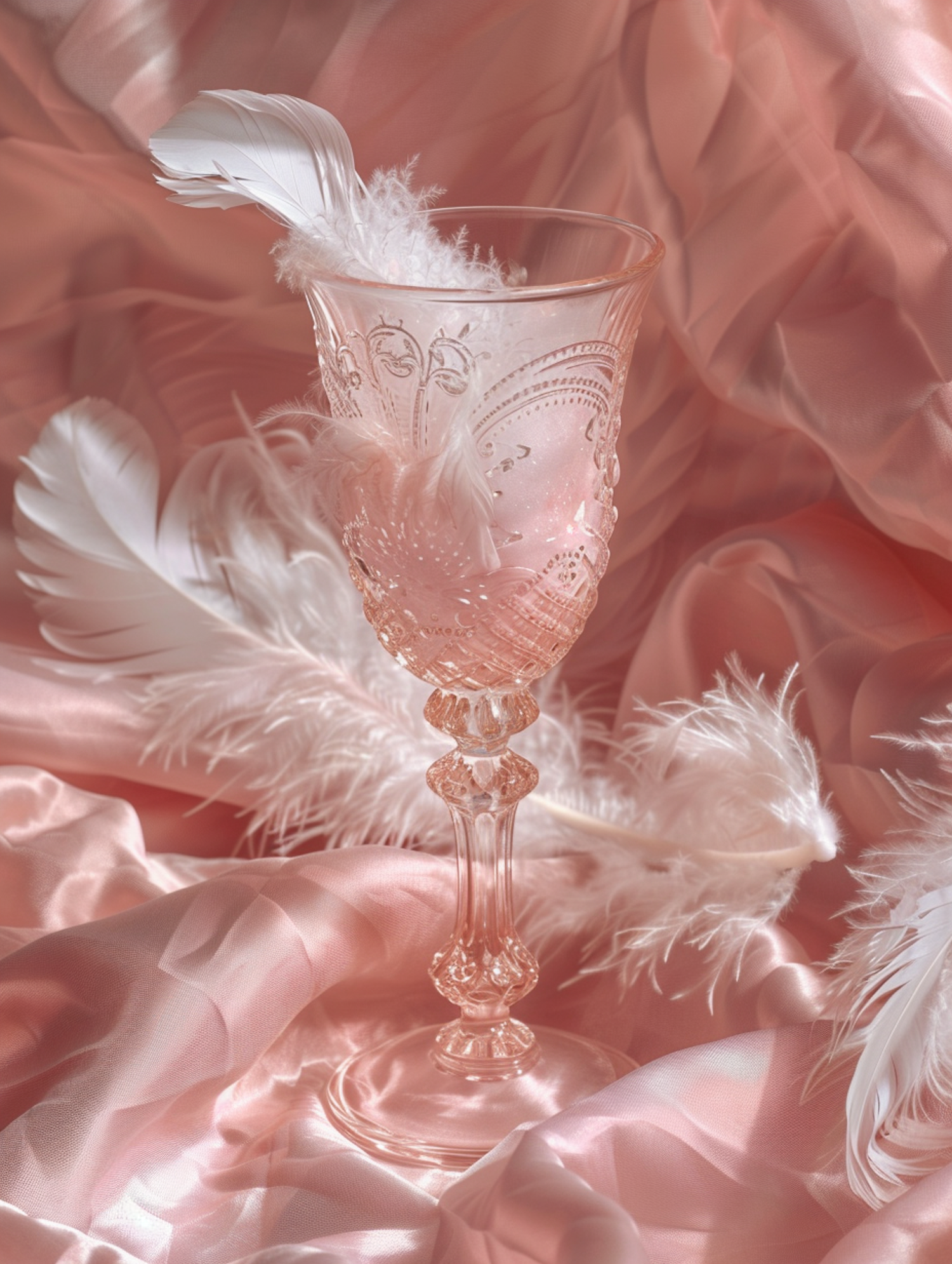 Elegant glass goblet with ornate patterns, surrounded by white feathers on soft pink fabric, creating a romantic and whimsical scene.