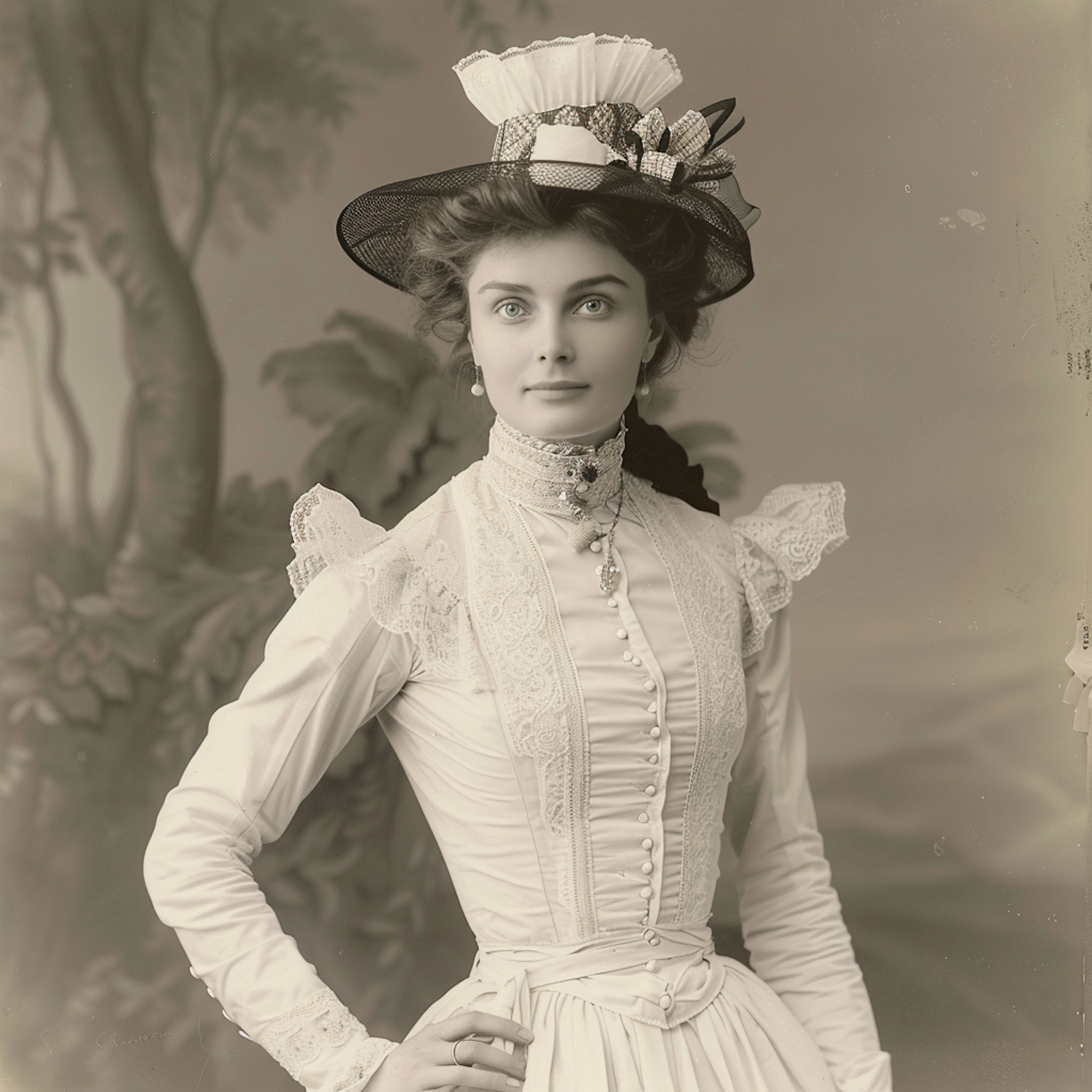 Elegant woman in vintage attire with lace hat and detailed dress, exuding grace and sophistication in a classic portrait setting.