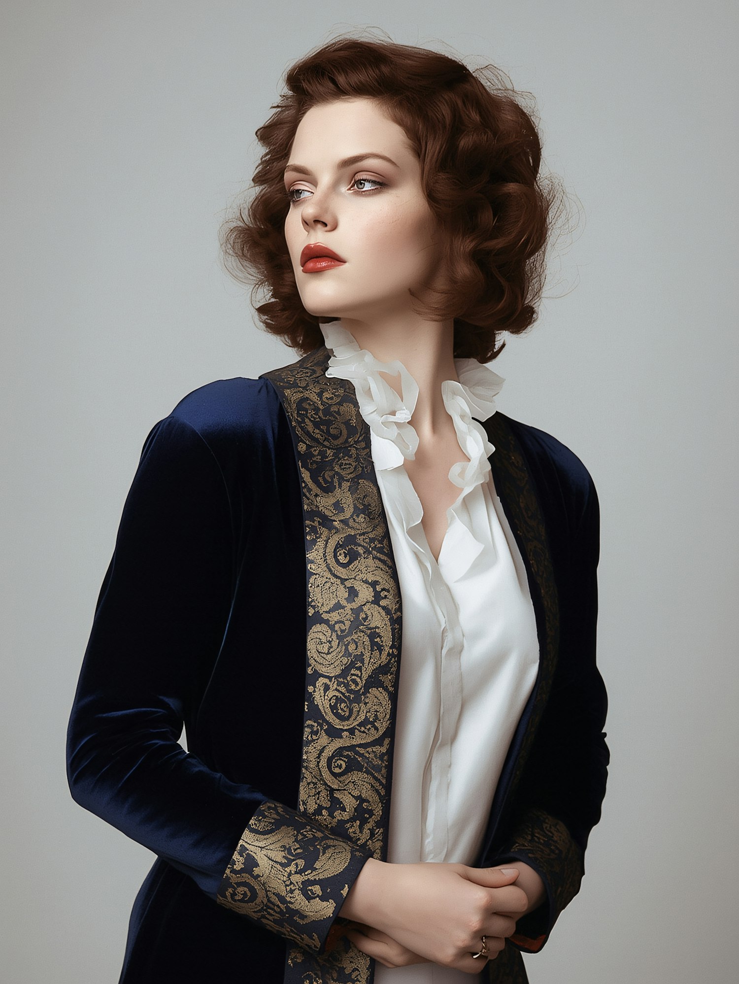 A poised woman in a blue velvet jacket with gold embroidery and a white ruffled blouse, styled with vintage elegance against a neutral backdrop.
