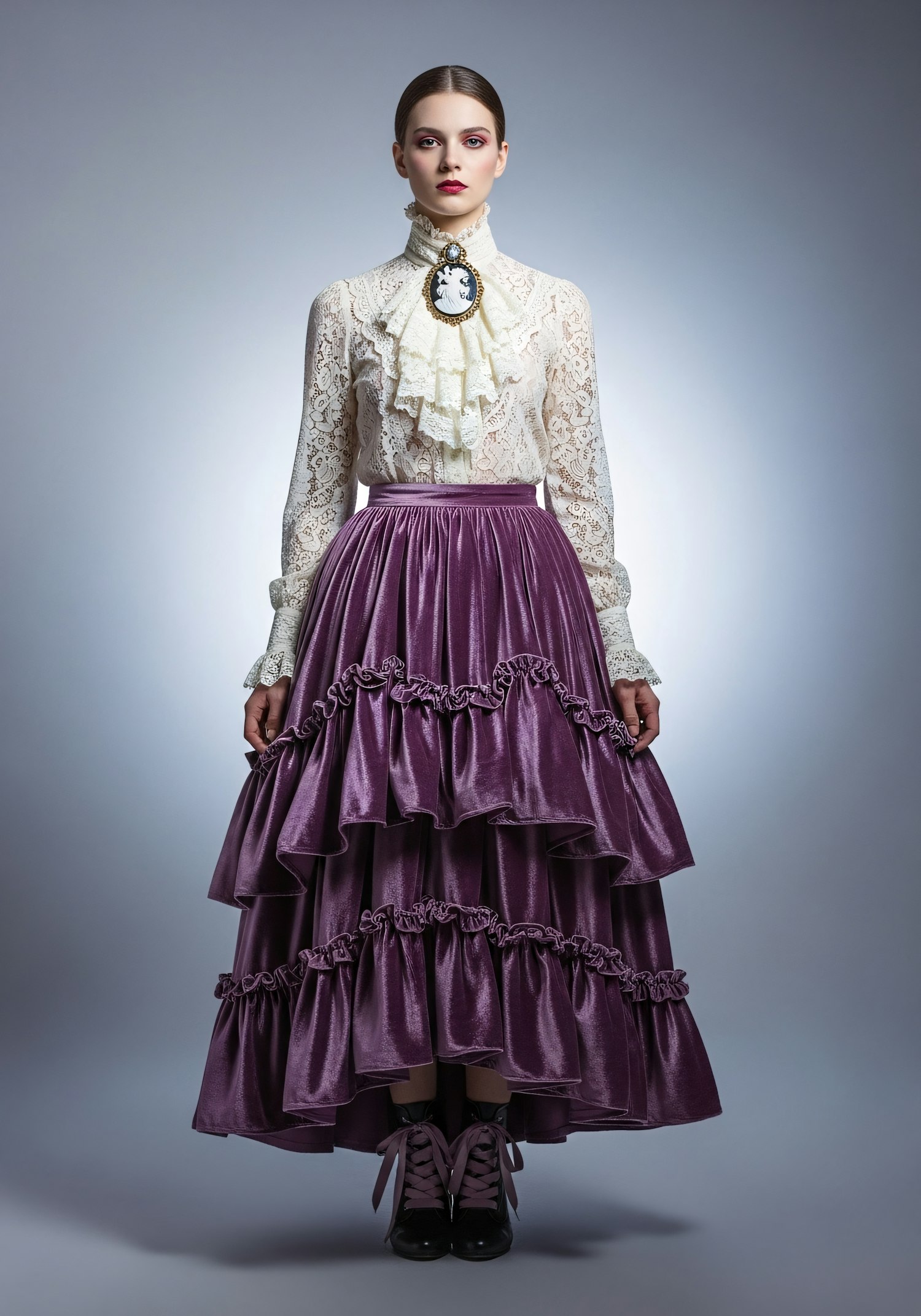 A woman in a vintage lace blouse and purple velvet skirt poses in a studio, showcasing elegant and intricate fashion details.
