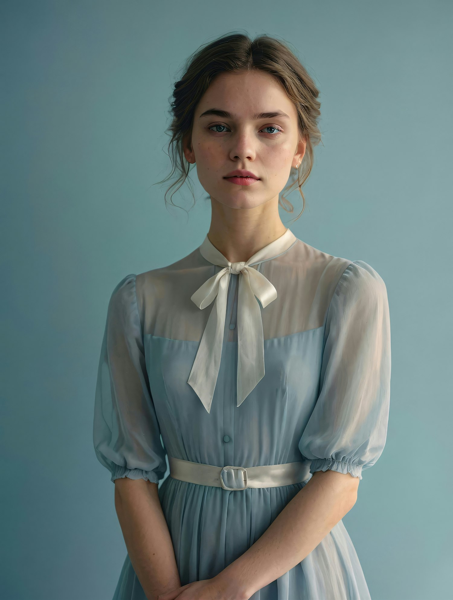 Young woman in a vintage light blue dress with sheer sleeves and a white bow, standing against a muted teal background.